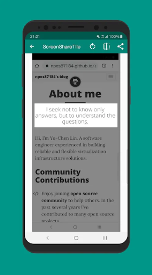 This is an open source project, the source code can be found at https://github.com/npes87184/ScreenShareTile.