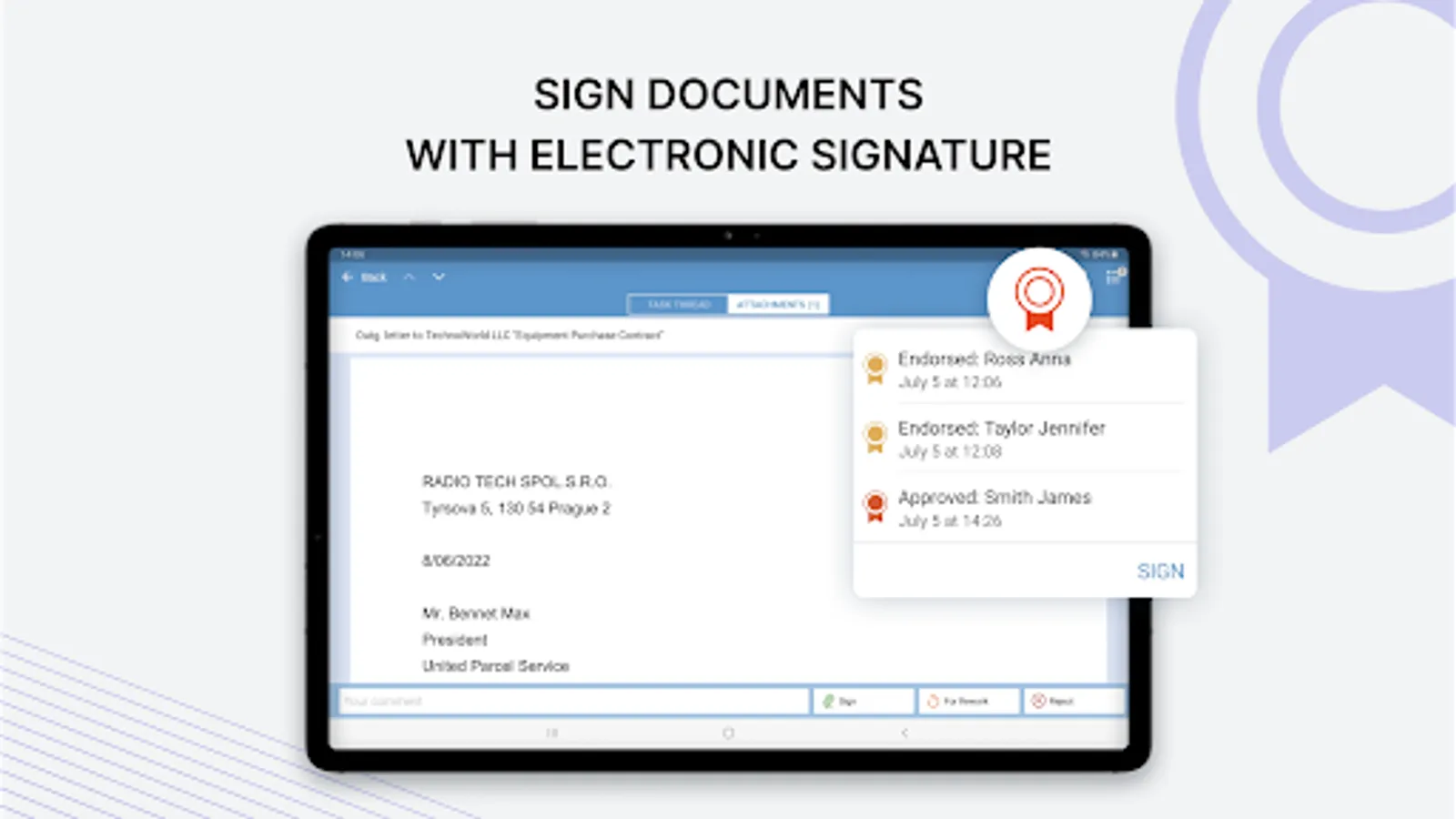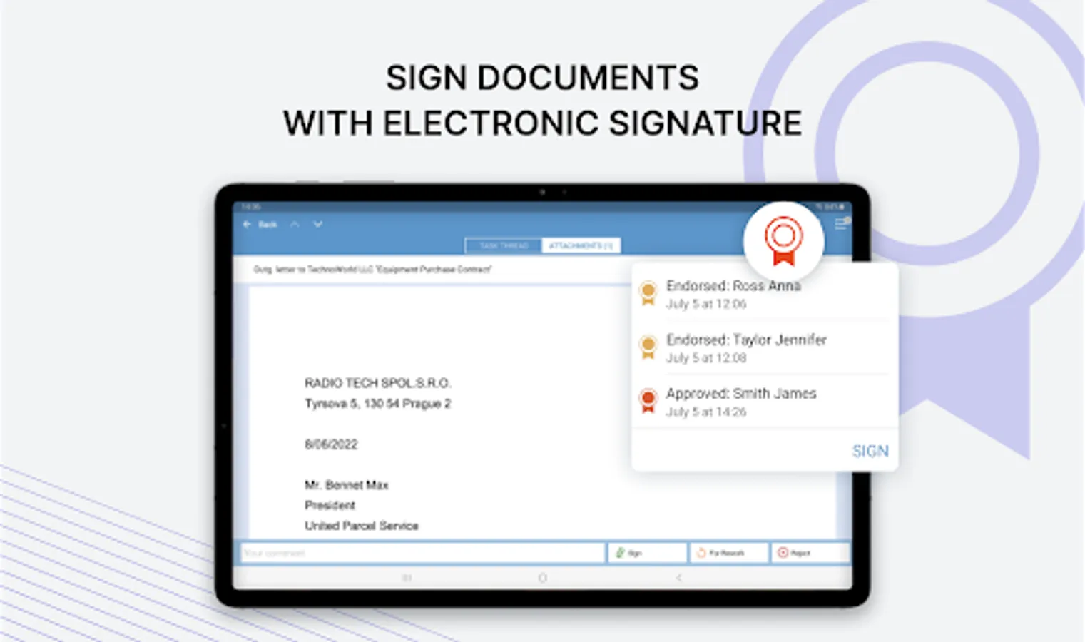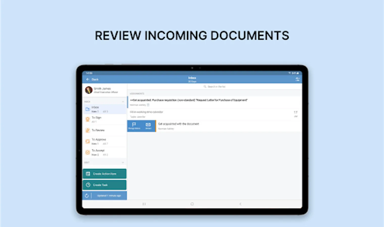 An important advantage is that the app features are available even without an Internet connection (offline). You can read, review, approve, and sign documents, create and execute action items, assignments, or jobs. Your changes will be automatically synchronized once you get network access.