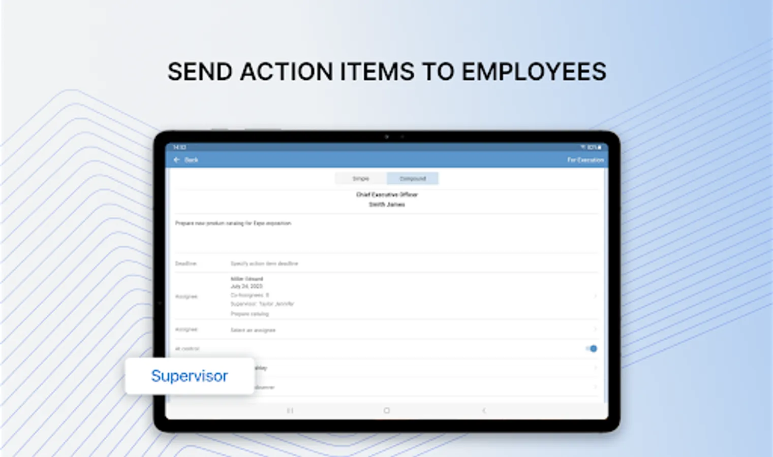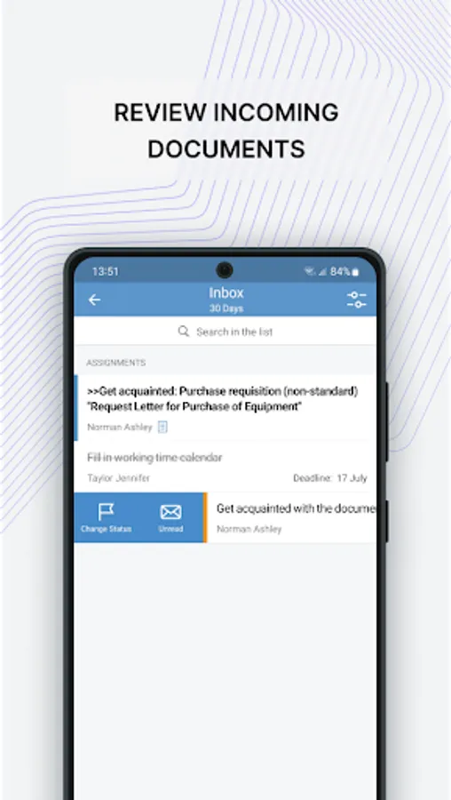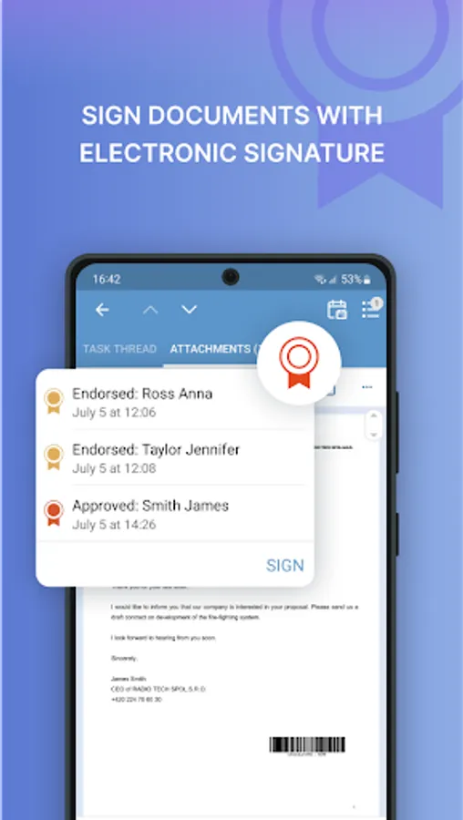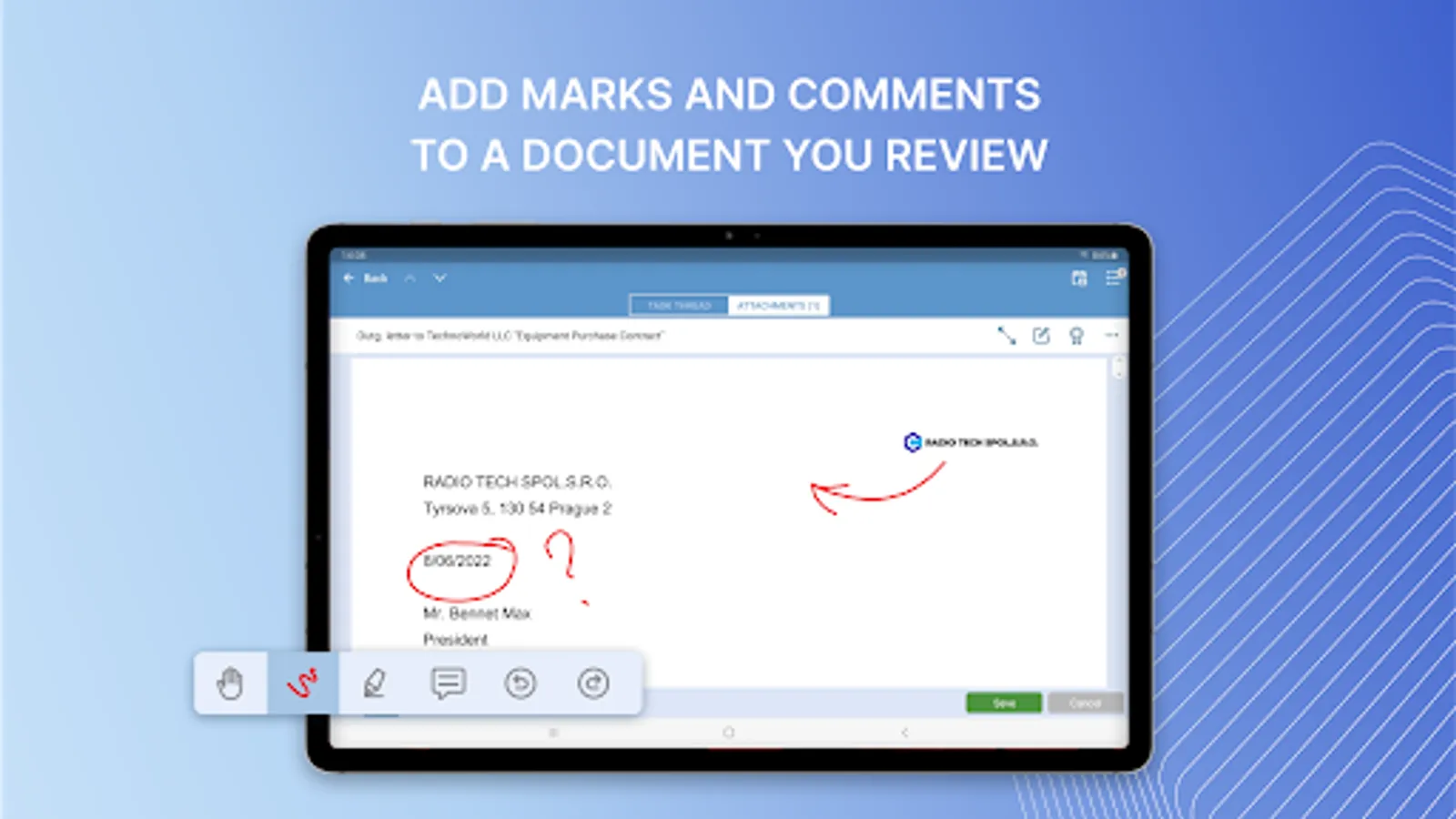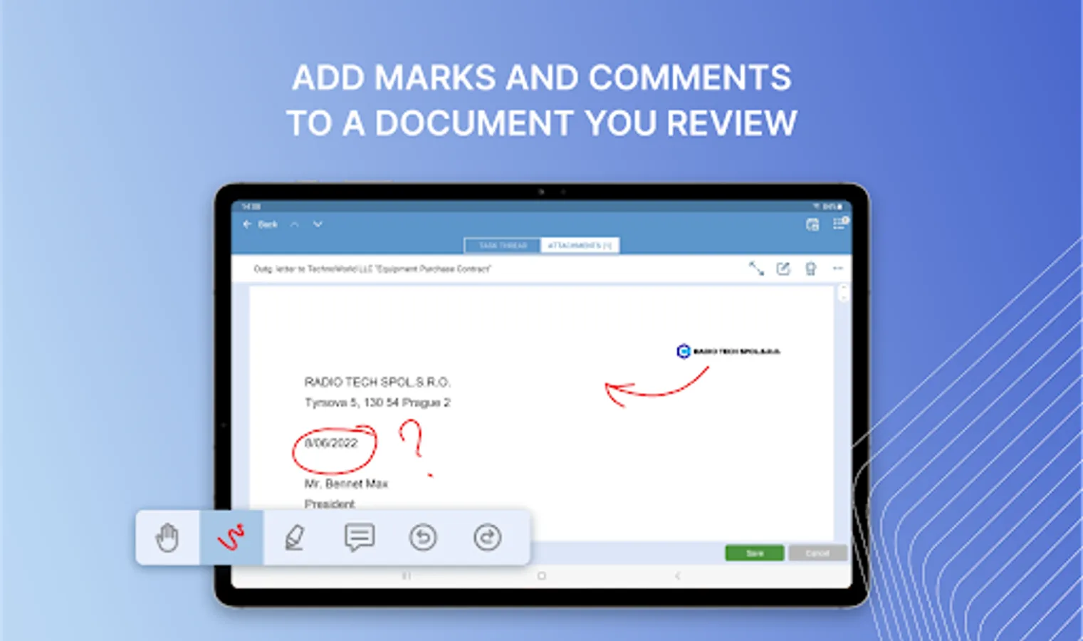 An important advantage is that the app features are available even without an Internet connection (offline). You can read, review, approve, and sign documents, create and execute action items, assignments, or jobs. Your changes will be automatically synchronized once you get network access.