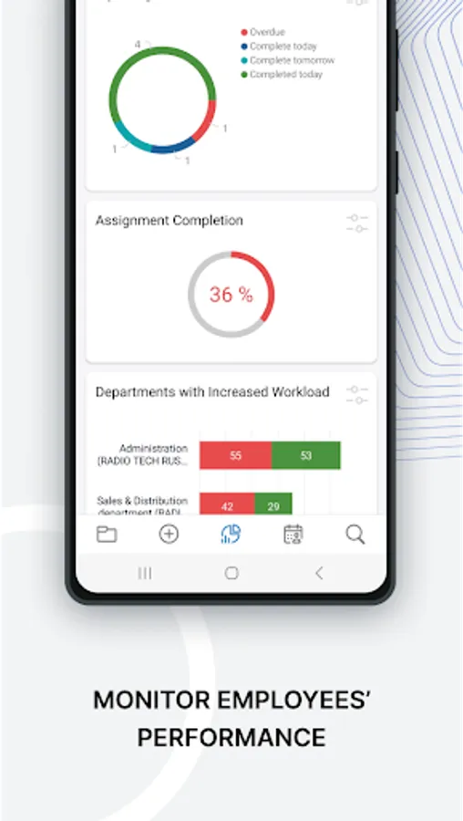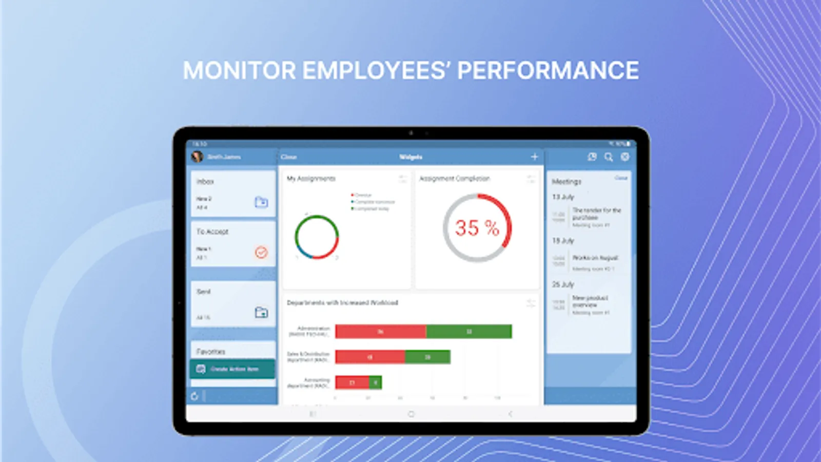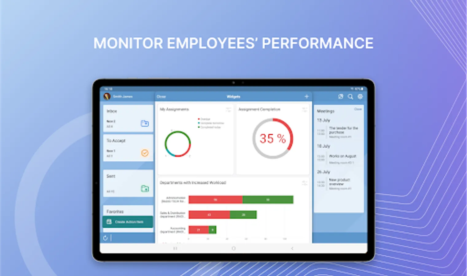 - Receive up-to-date information about efficiency of company business processes, employees’ performance and workload by using widgets