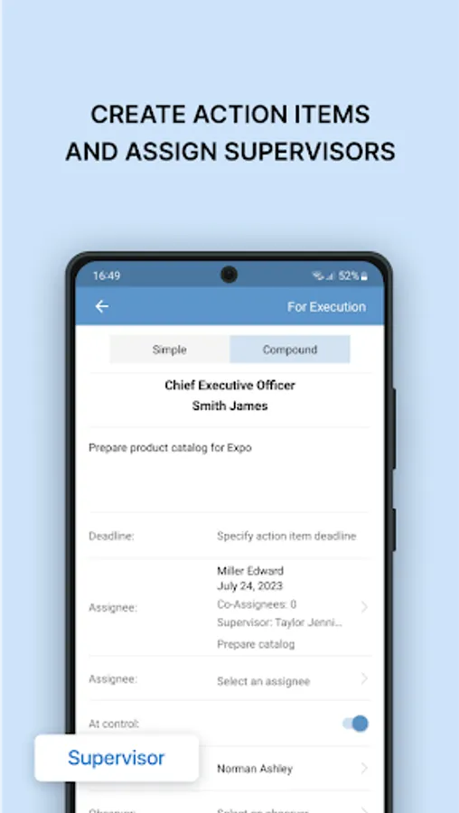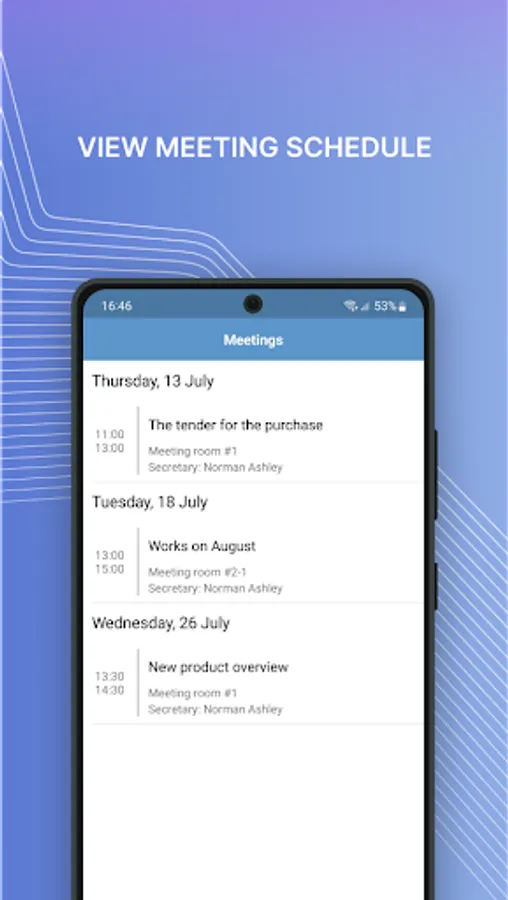 - View the list of upcoming meetings and documents related to them, add materials, and monitor the execution of action items and assignments resulting from the meetings