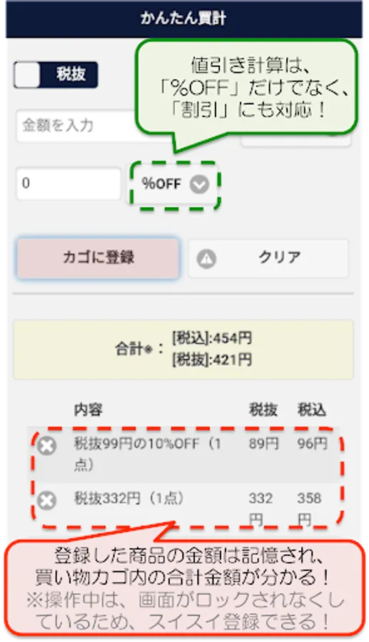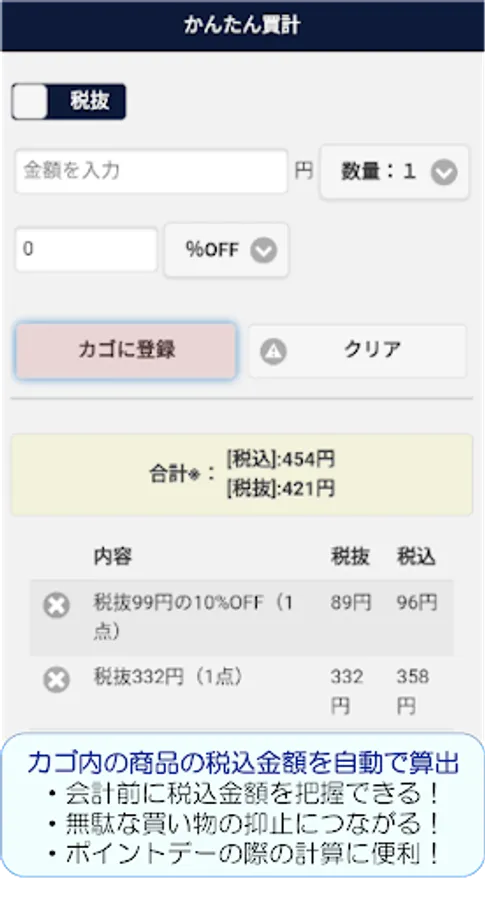 By using “Easy Purchase”, you can quickly calculate “discount” and “consumption tax” with intuitive operation, and you can grasp the total amount in your shopping cart.