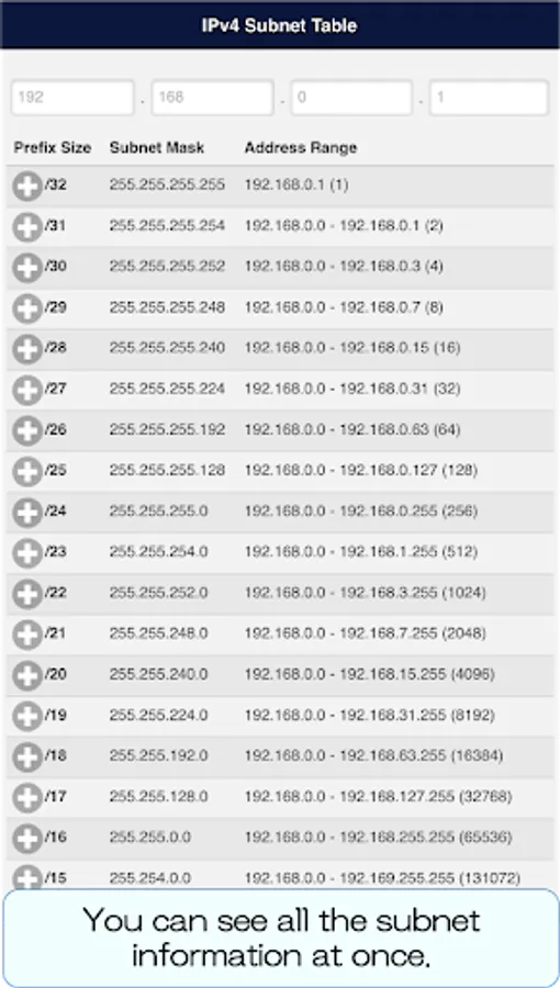 Subnet Table is used to divide an IP network into subnetworks by calculating network address, subnet mask, broadcast address and host IP address range.