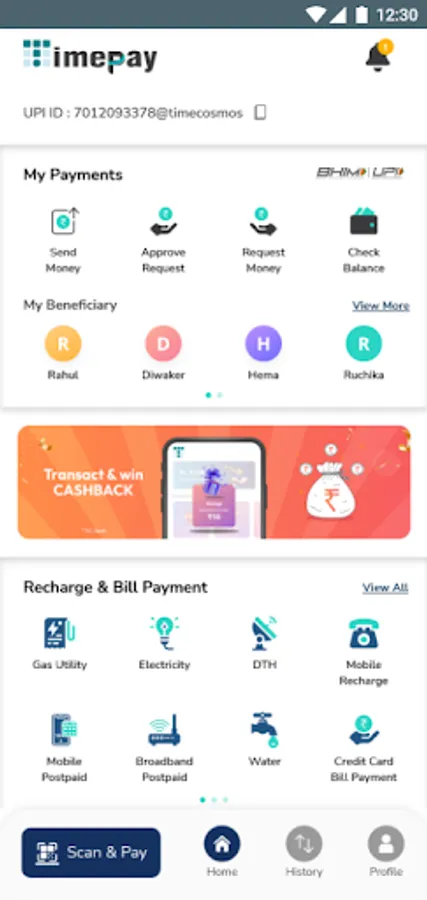 Introducing TimePay - your all-in-one payment app! Seamlessly manage payments with BHIM UPI, credit/debit cards, and wallets. Top up your mobile, settle utility bills, and shop at your favorite stores, both offline and online. Experience hassle-free investments in mutual funds and insurance plans. With TimePay, link your bank account for instant money transfers via BHIM UPI, ensuring a safe and secure platform. Say goodbye to internet banking - TimePay has got you covered for all your financial needs!