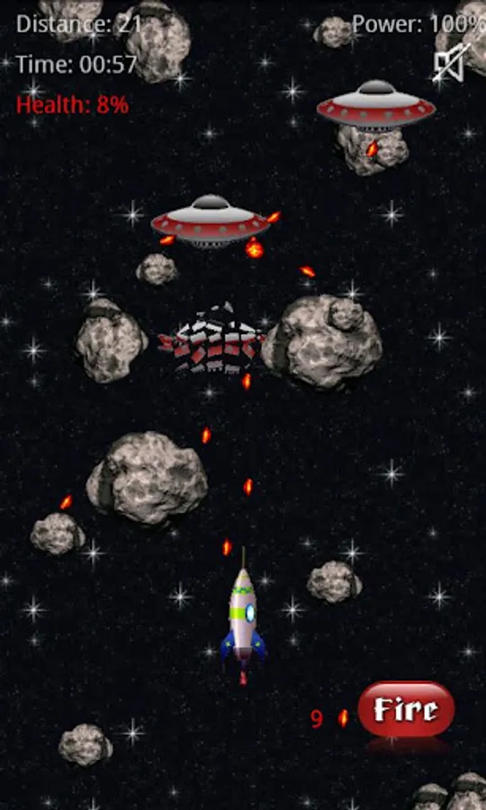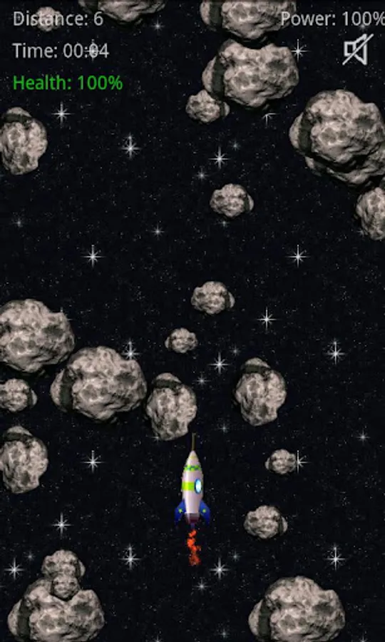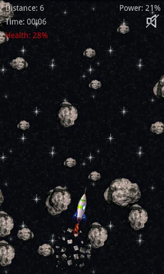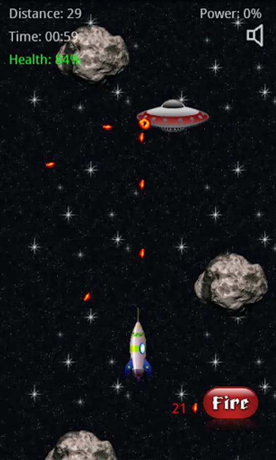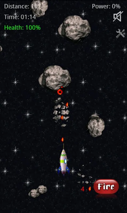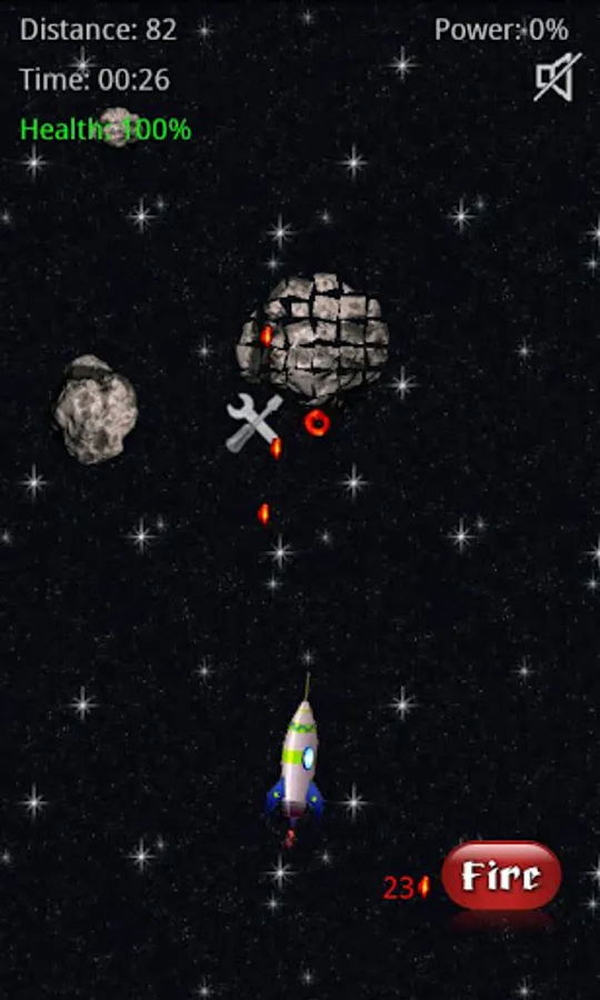 Tilt your phone forward to increase rocket power. Tilt to the sides to move right or left. Press the "Fire" button to fire a rocket missile. Collect repair tools to repair your ship.