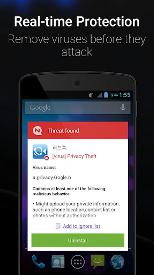 Antivirus: Features Antivirus: Removes viruses, malware and trojans while scanning downloaded and installed apps in real time for maximum phone protection.