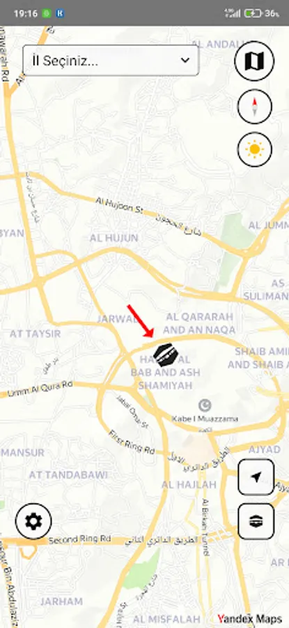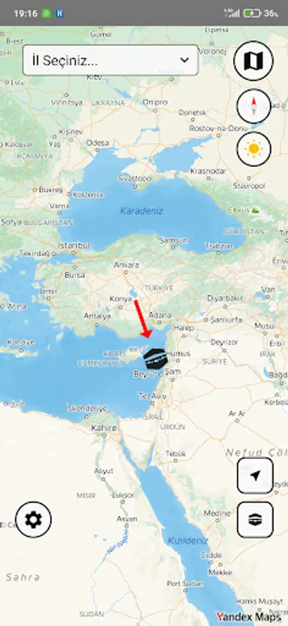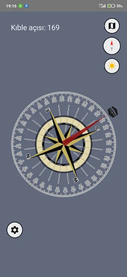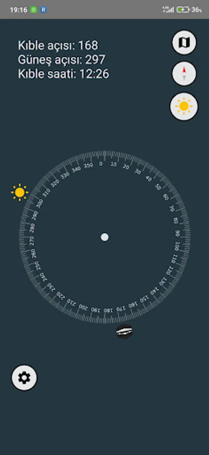 With this method, you can easily find the qibla, especially in situations where a map is not useful, such as in open terrain. To determine the qibla using this method, turn your device so that the sun sign is on the side of the sun. The side pointed by the Kaaba sign shows the qibla.
