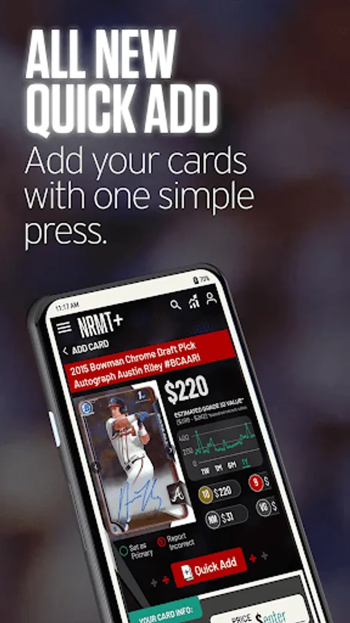 Keep track of your cards' values using our proprietary NRMT pricing guide. We price modeled 1,000's of cards to put together what we believe is the most realistic model for the value of your cards in the current market. And enjoy every little detail with front and back images of nearly 50,000 cards. And if you can't find it, yes, you can add it.