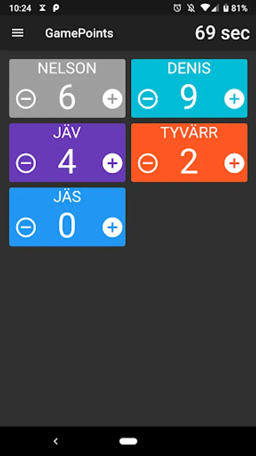 GamePoints can be used to keep track of each player's points in any game. It has the option to use a timer that limits each round and also has an option to store player names to disk for easy re-use when the app is used again at a later time.