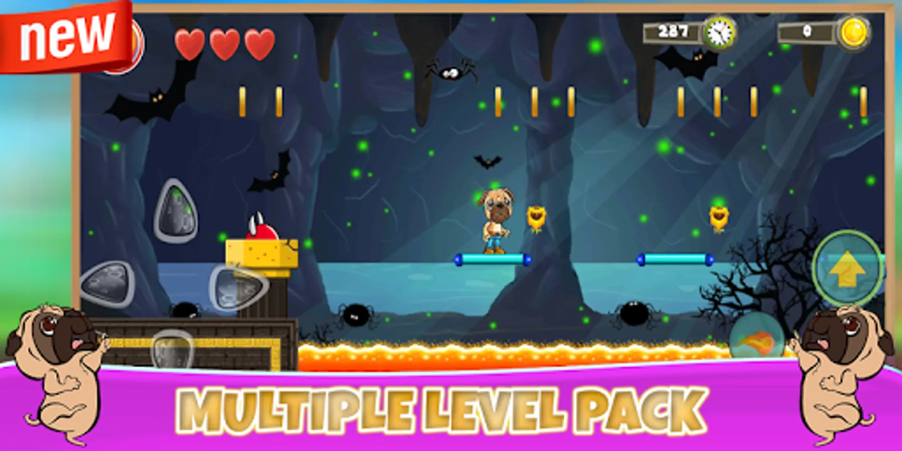 - Run and jump through exciting levels and discover scary places with lots of hiding dungeons. Be smart, be quick, and help the little Pug to collect coins hidden in a collection of exquisitely designed levels. It is determined to complete its mission!