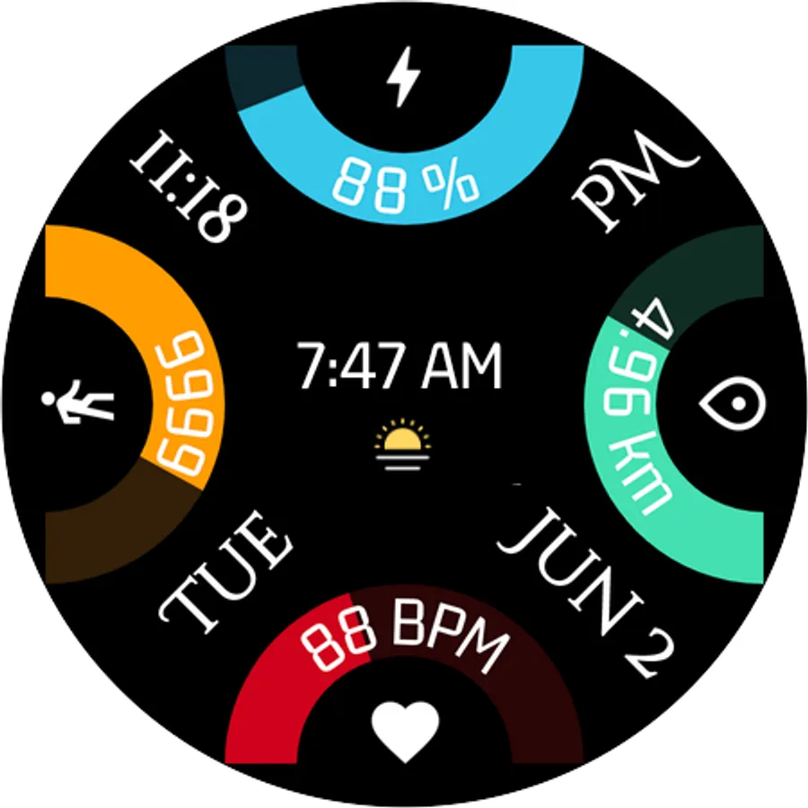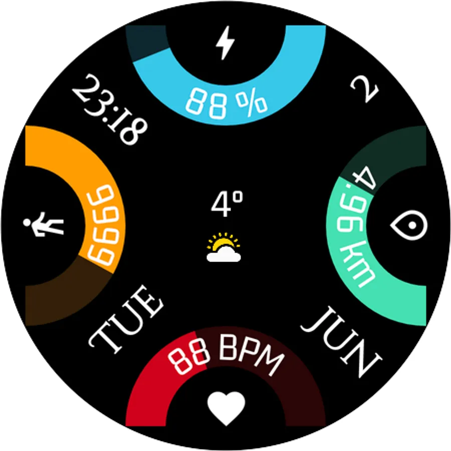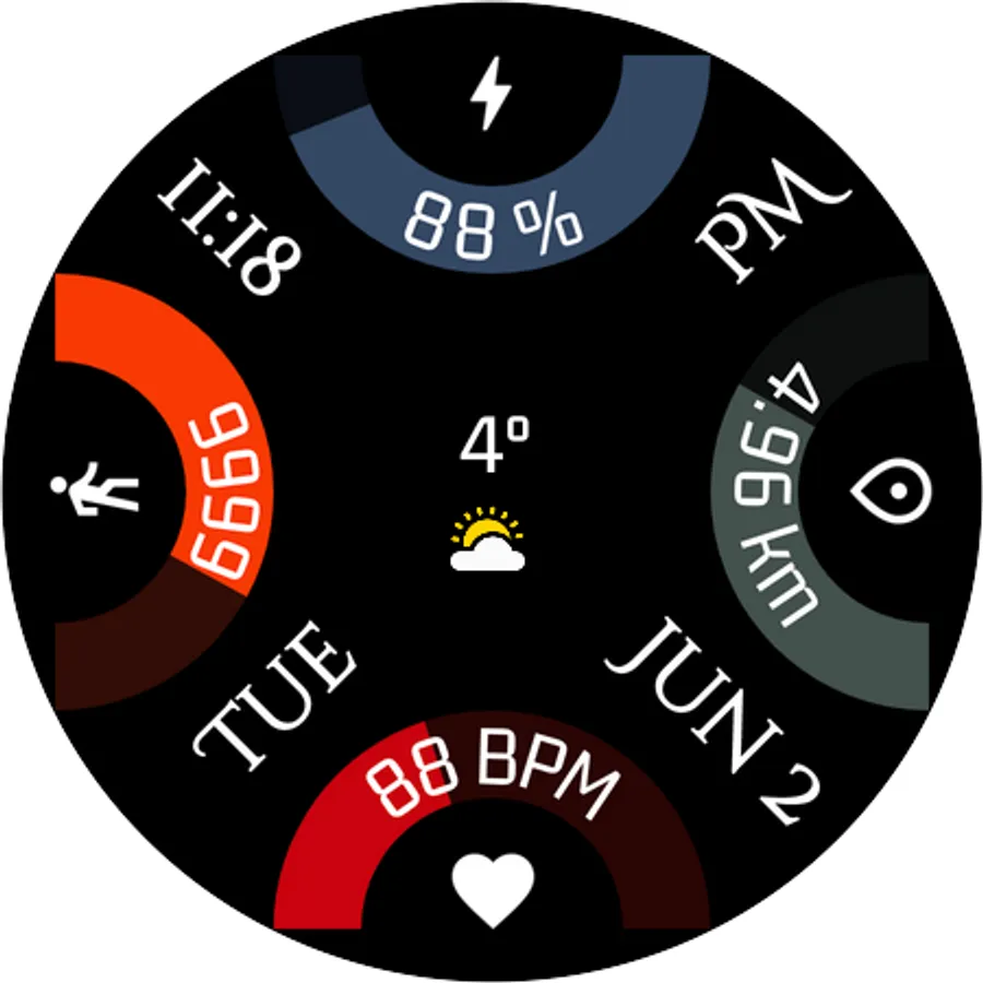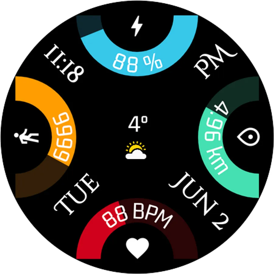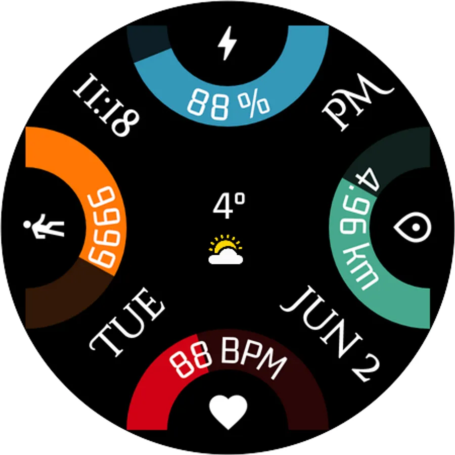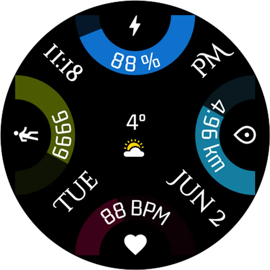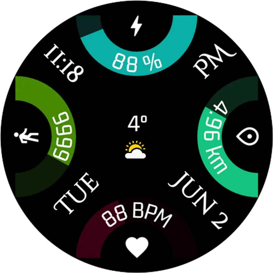 A simple, clean and beautiful Wear OS digital watch face with battery, steps, distance and heart rate progress half circle.