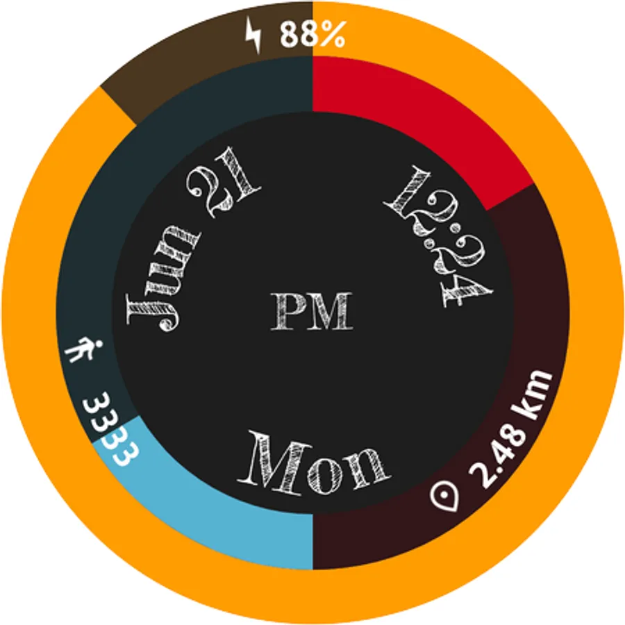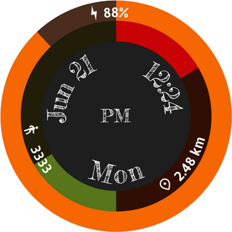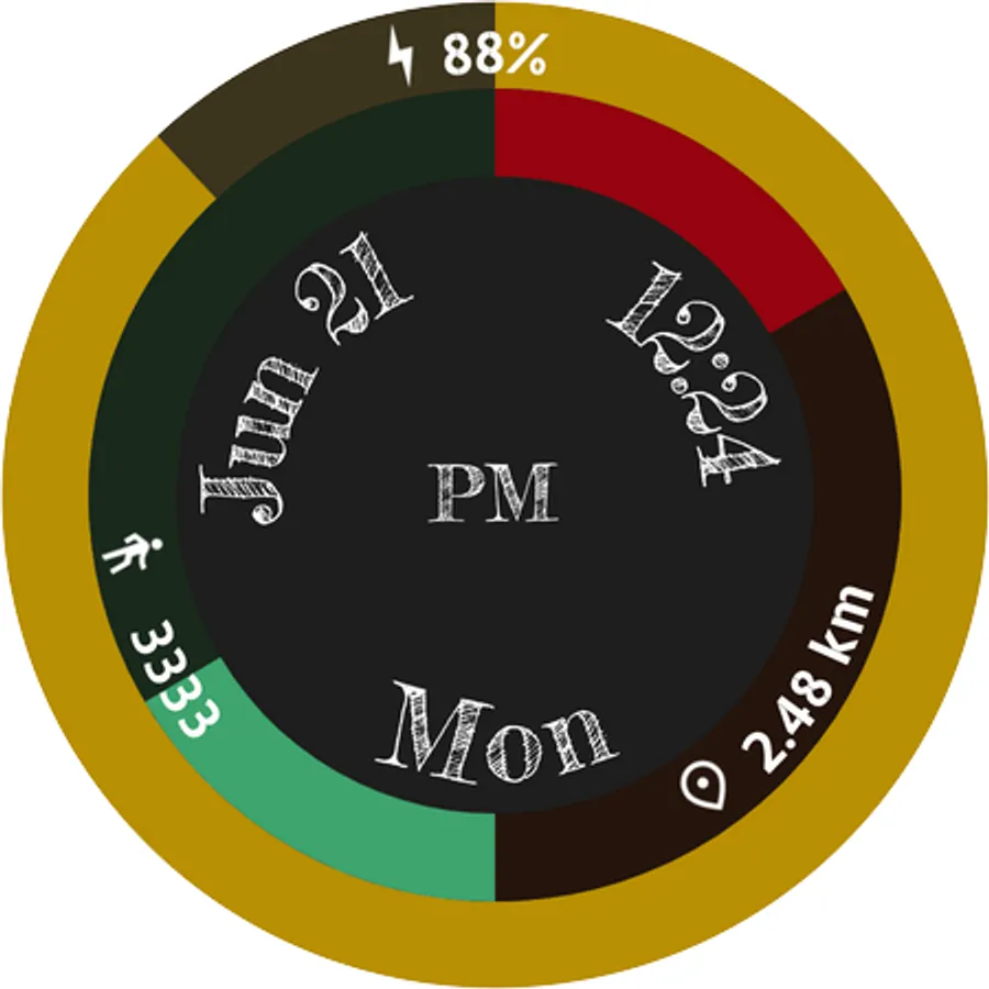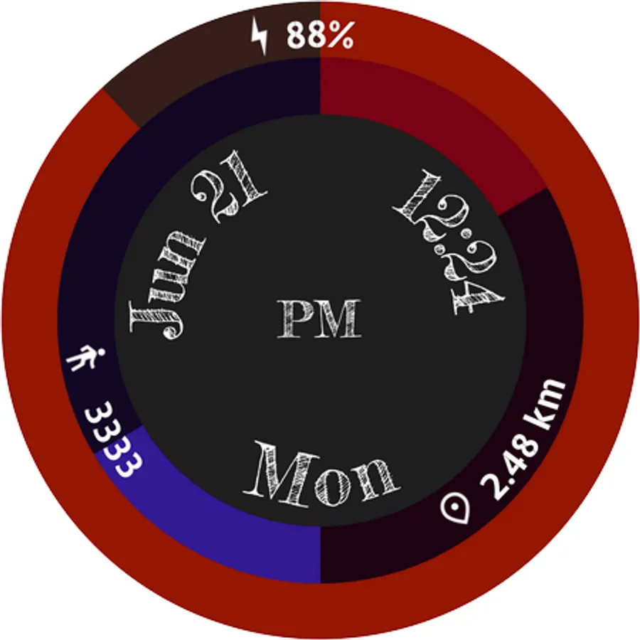 A simple, clean and beautiful Wear OS digital watch face with battery ring and steps and distance half rings.