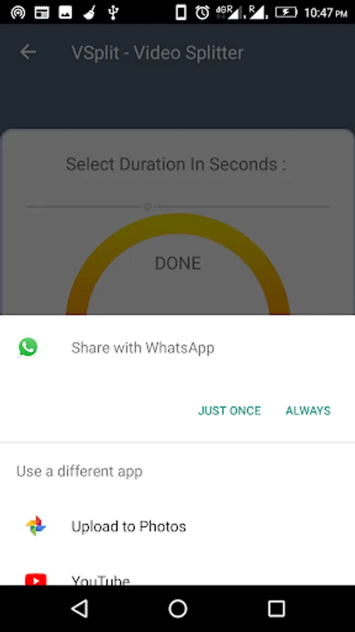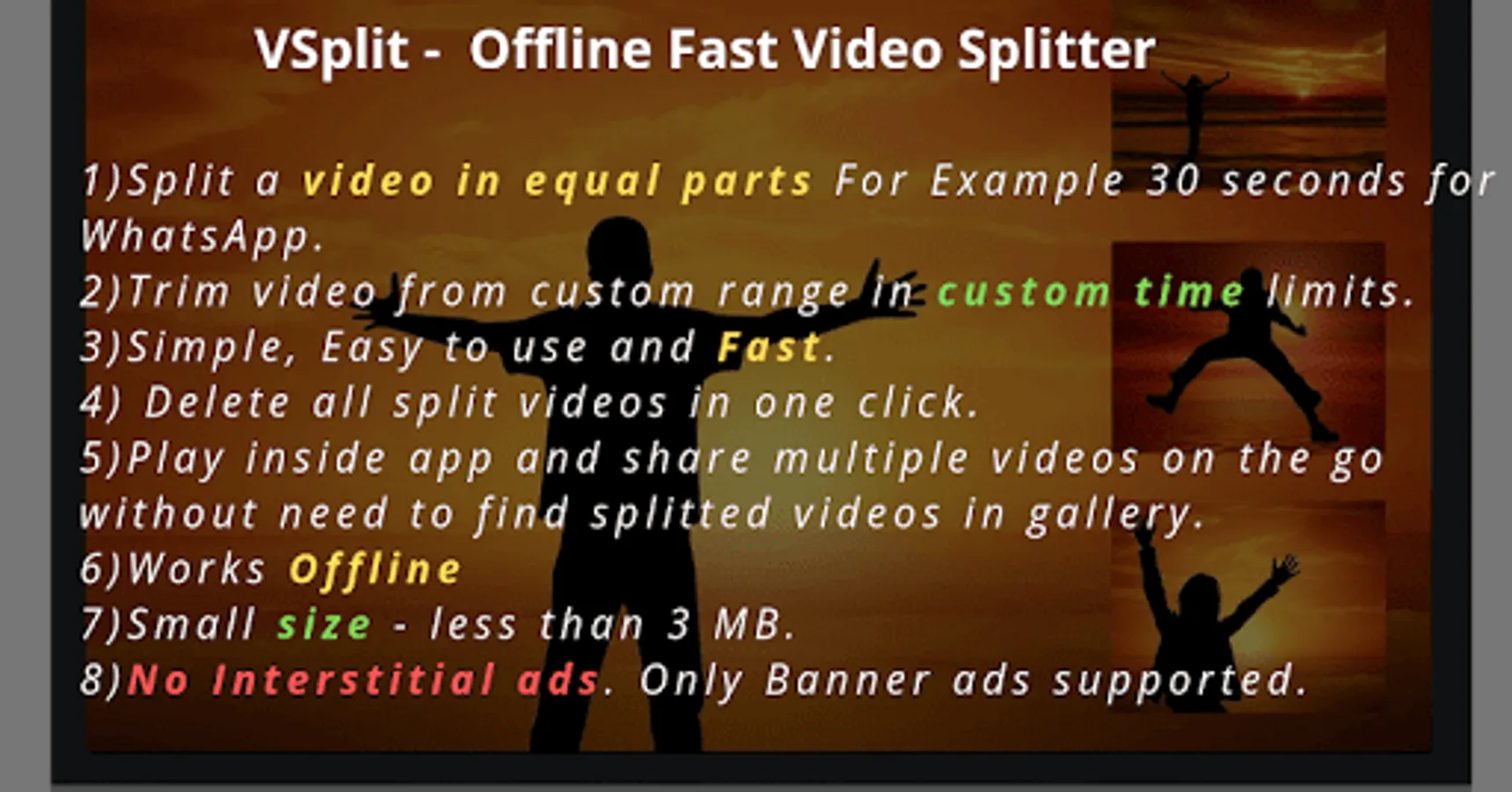 This small app makes easy to make splitting for videos to make stories for WhatsApp, Instagram, and other social media. It stores all videos inside a custom folder (VSplit) so that you can manage them easily.