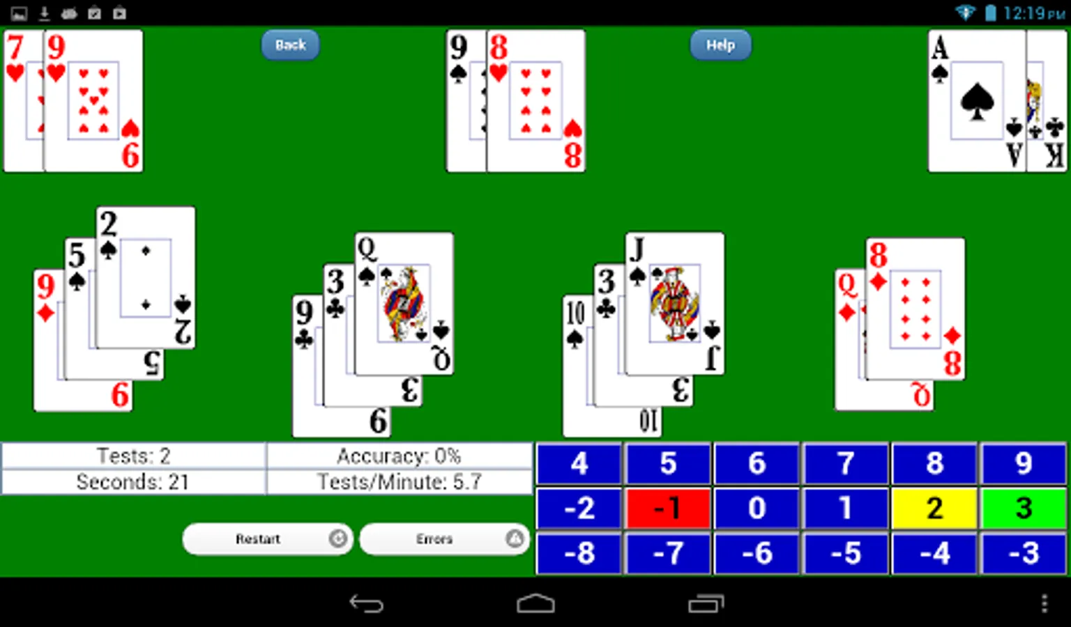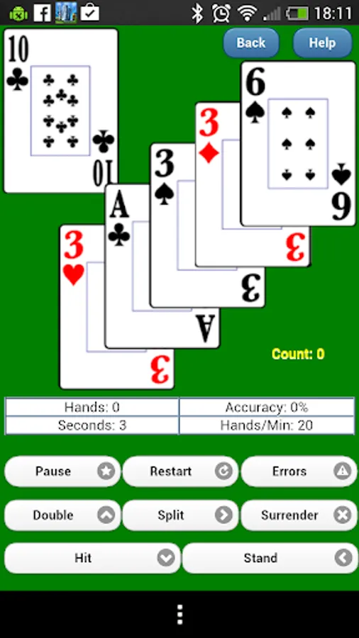 • Optimizing your time – Hands are NOT thrown at you completely randomly. More difficult hands are presented more often. You can be drilled on up to five-card hands, which are substantially more difficult than two-card hands. For counting practice, the shoe can be biased toward a positive or negative count to increase difficulty. You can program it to throw cards out in different orientation, placement and numbers. It will remember errors you have made and present you with those hands. Speeds can be increased beyond the speed of human dealers. These features are designed to make better use of your time. Why waste your time on simple hands like player 20 vs. dealer ten-up, that are very common with random dealing, over and over and over?