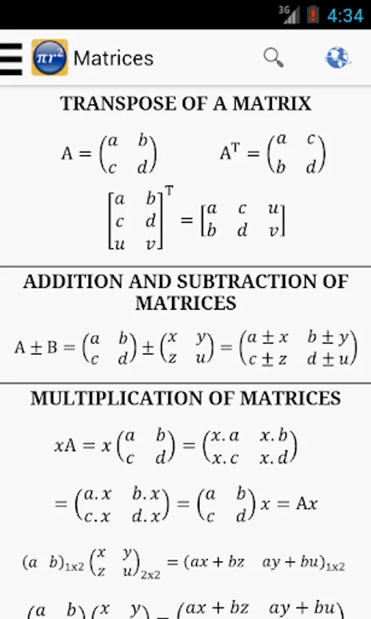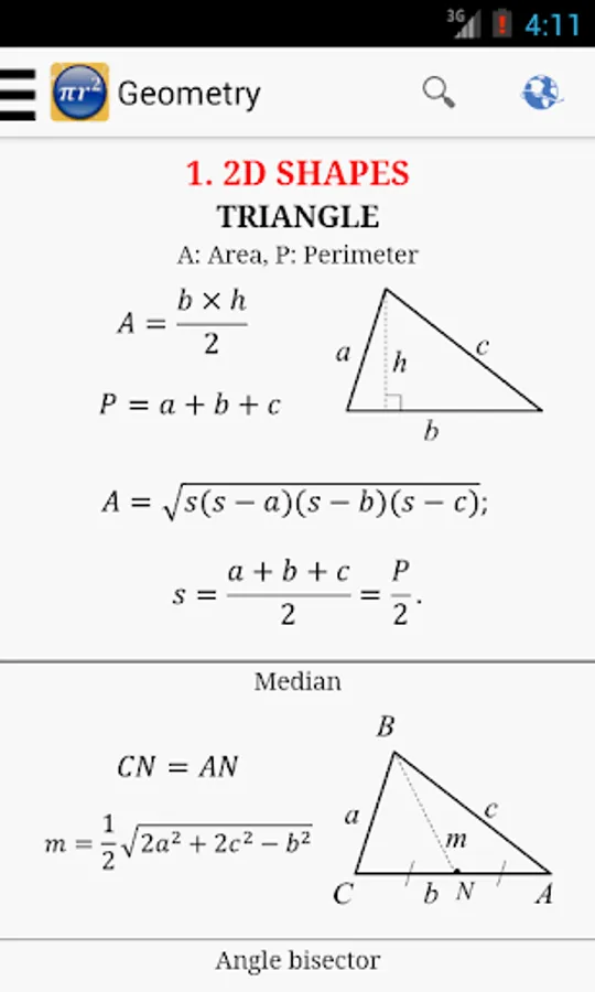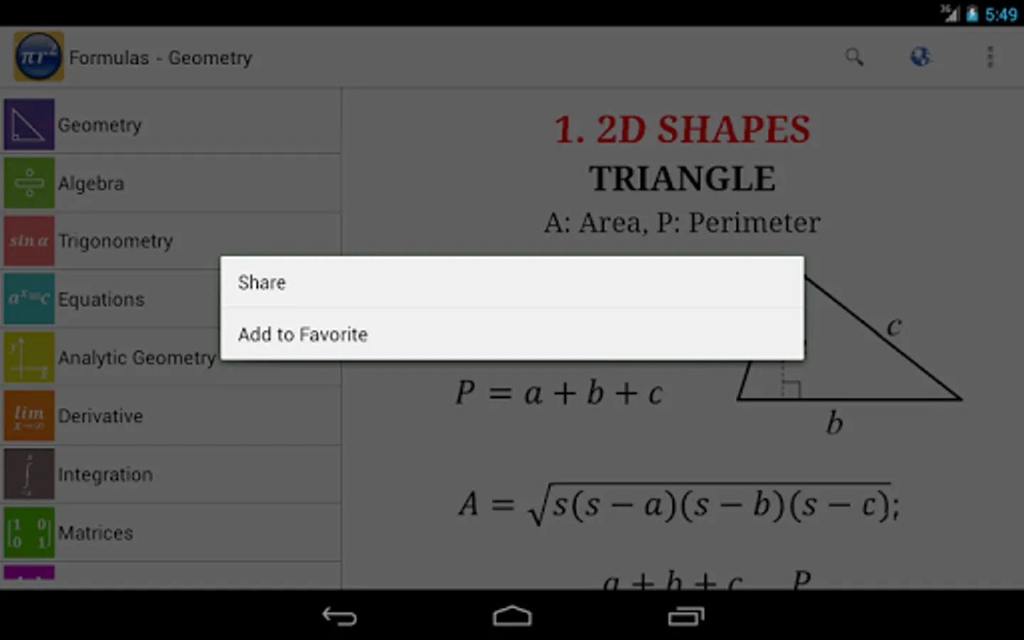 Available in many languages, "Maths Formulas" is a perfect app that provides all basic and advanced formulas in mathematics. It's very convenient for all students in high school or university and engineers to look for any easy or complicated formulas. It includes: Geometry, Algebra, Trigonometry, Equations, Analytic Geometry, Differentiation, Integration, Matrix, Probability and Statistics, Transforms.