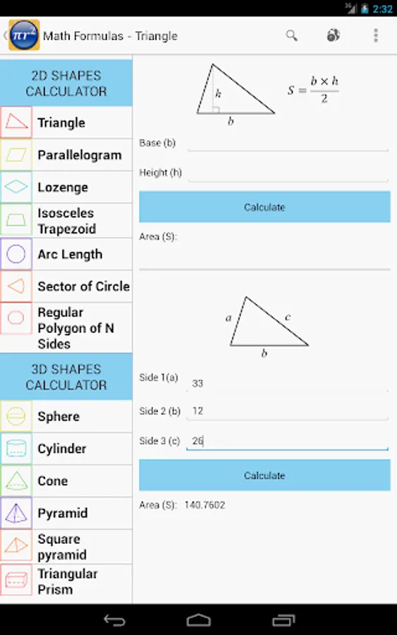 This app also has a number of tools to calculate the geometry shapes or find the roots of equations. Users can also share any formulas to friends by many ways: email, print, or facebook.