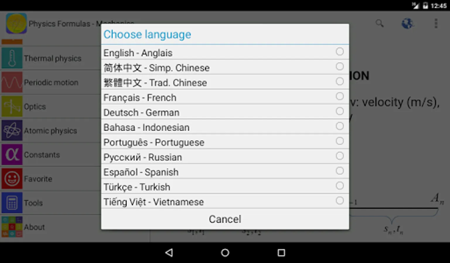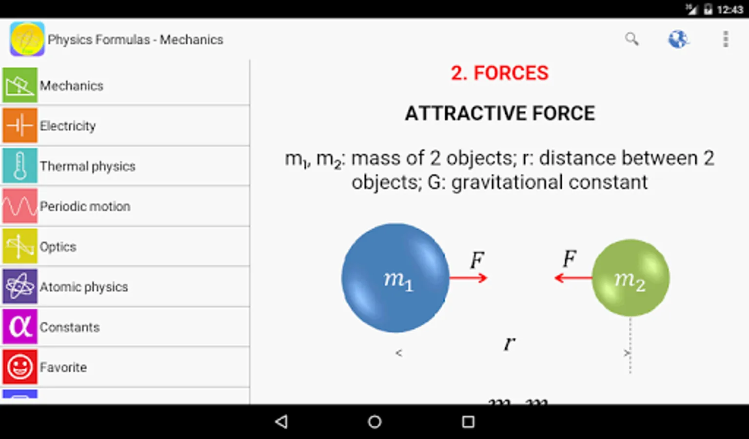 From the success of Maths Formulas app, Physics Formulas has been developed and released to help users quickly refer to any Physics formulas for their study and work. This app displays most popular as well as advanced formulas in seven categories: Mechanics, Electricity, Thermal physics, Periodic motion, Optics, Atomic physics, Constants.