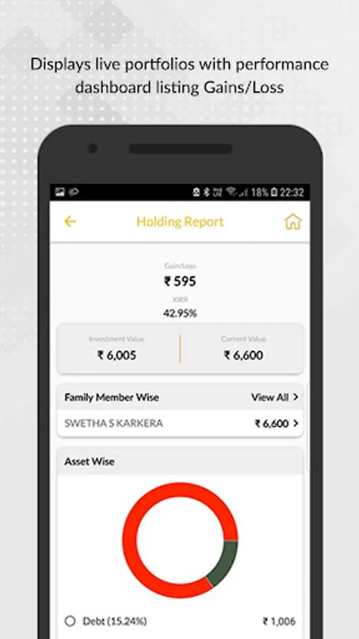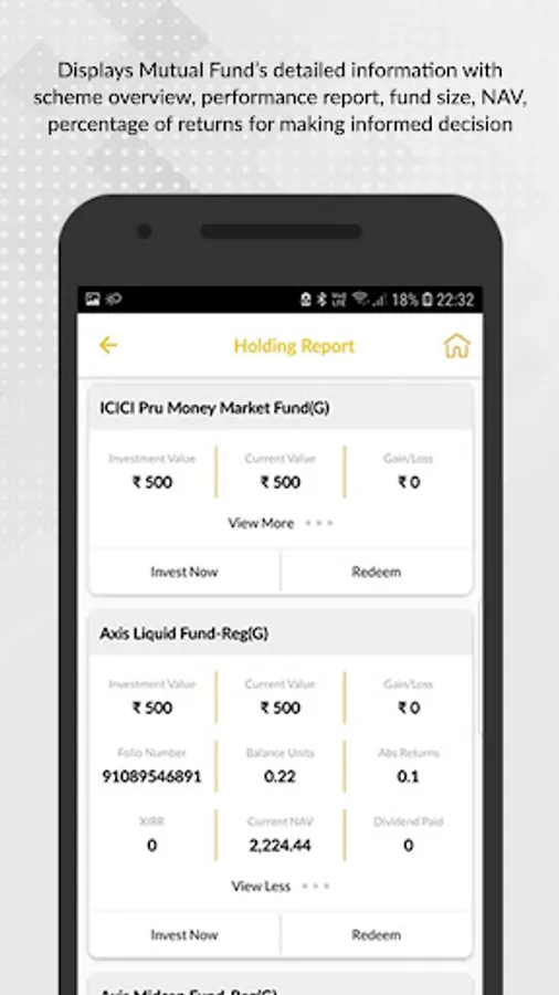 You can effortlessly open your full KYC account and start investing right from day one. The app enlightens the investor with significant mutual funds information like (Nature of Fund, AUM, NAV, Percentage of Returns) this simplifies your investment decision. It is built under the philosophy of "Informed Investor is a Prudent Investor". The app also recommends scheme to investors basis on their performance.