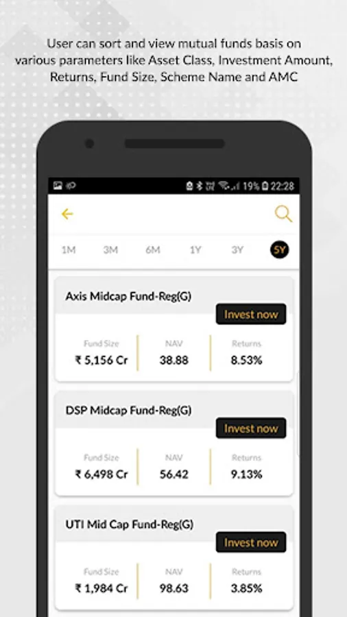 4. User can sort and view mutual funds basis on various parameters like Asset Class, Investment Amount, Returns, Fund Size, Scheme Name and AMC