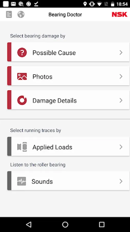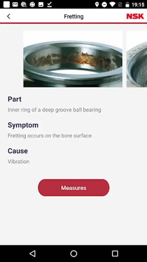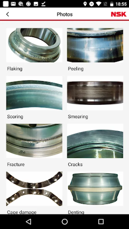 The app also includes many images and sound clips to help users diagnose types of bearing damage and possible causes. Detailed explanations help users learn the key characteristics of different types of bearing damage.