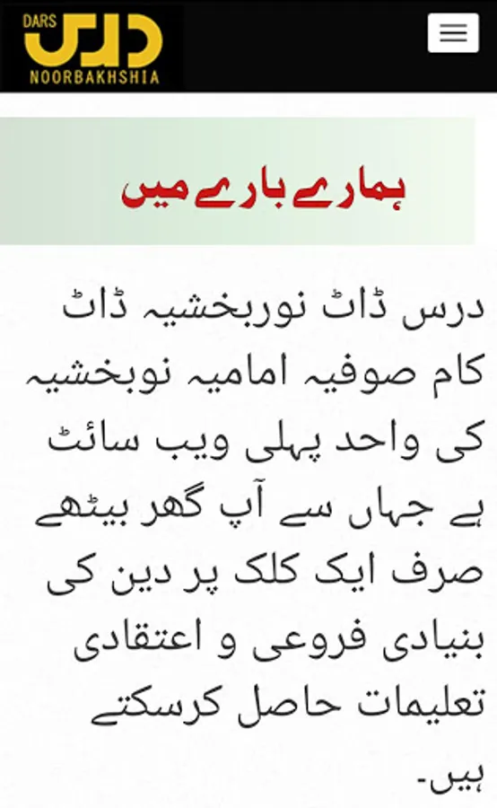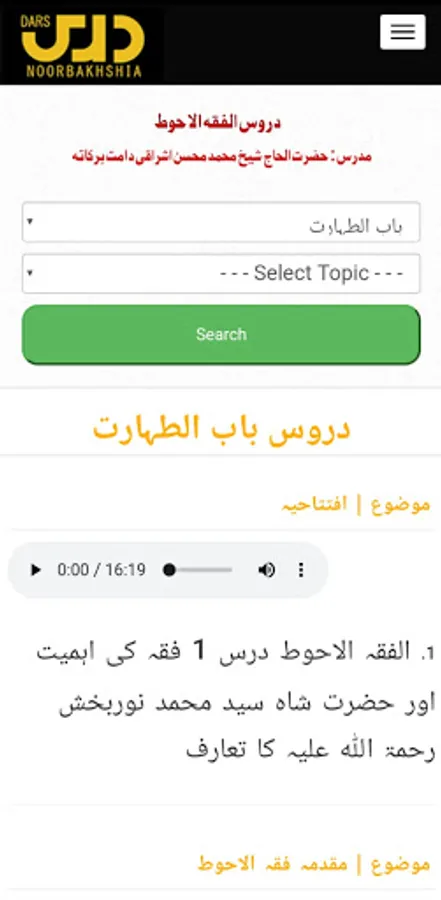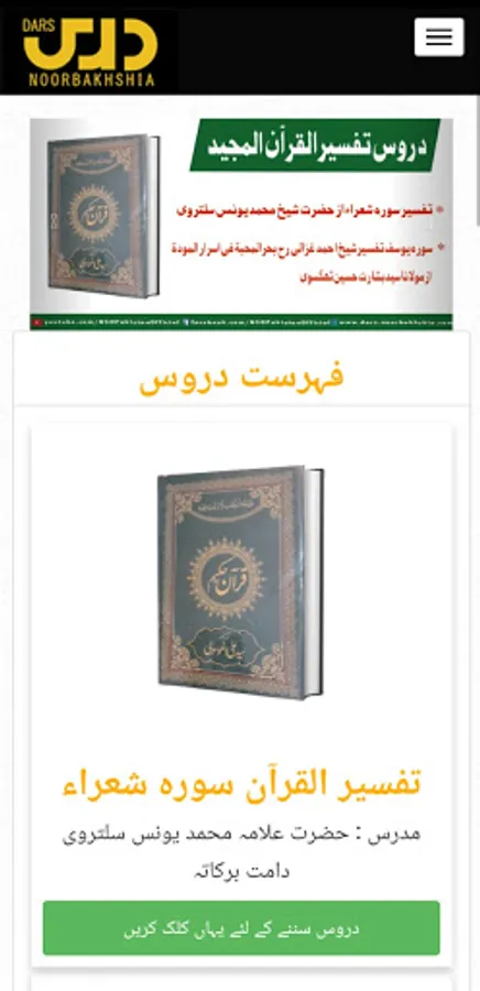 Dars e Noorbakhshia app contains thousands of lectures of Mazhab e Sofia Imamia Noorbakhshia which delivered by different scholars, details are mentioned below: