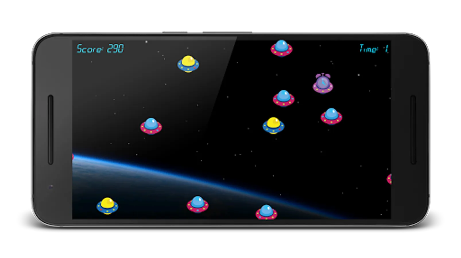 This is a typical time challenge game, with a simple goal to kill as much as you can enemies in 20 seconds. There are three kinds of invaders - Pink, blue and purple UFOs. Destroying pink and blue UFOs will reward you with a score. Destroying the purple one will give you additional 5 seconds.