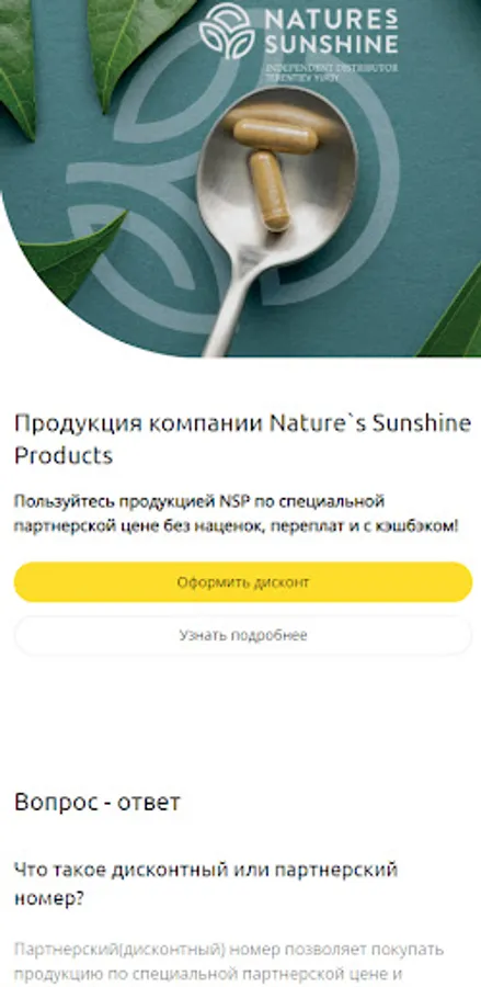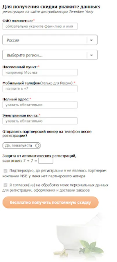 The application was developed by NSP distributor (Yu.A. Terentyev). Electronic registration for the purchase of products at a discount in the official service centers of the company. Only for new partners! If you already have an affiliate number with NSP, do not install the application! If a familiar person told you about NSP, ask him to personally register you!