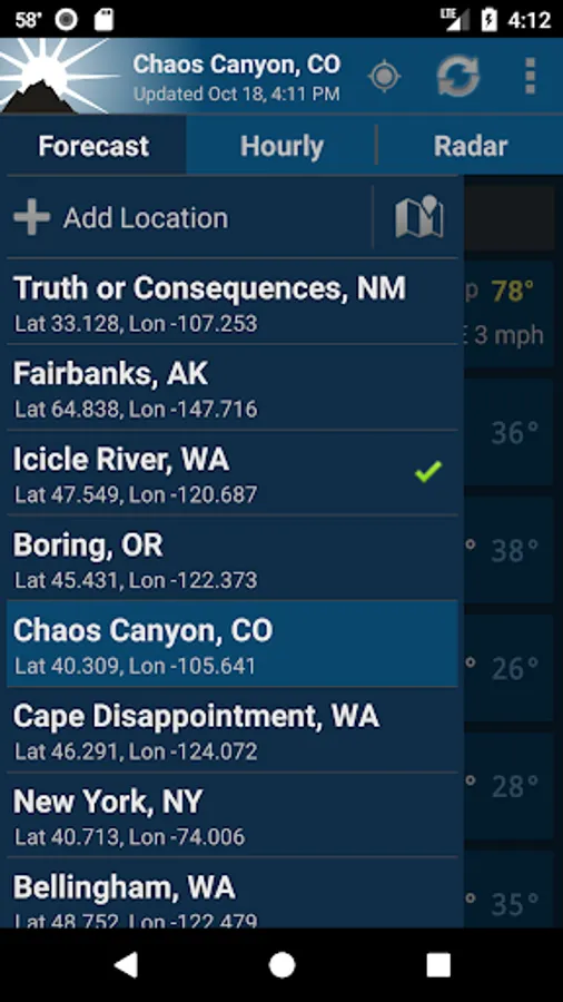 This app uses NOAA point forecasts from your GPS location to get the most localized weather available. Point forecasts are great for climbing, hiking, skiing, or any outdoor activity where weather from a nearby city isn't accurate enough.