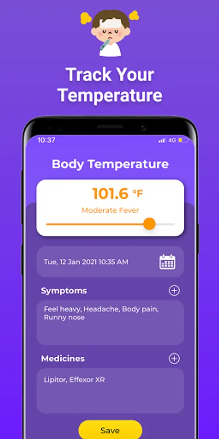 This is an application to record the measured body temperature. Keep Current Body temperature values save history view stats, graphs, analysis, reports.