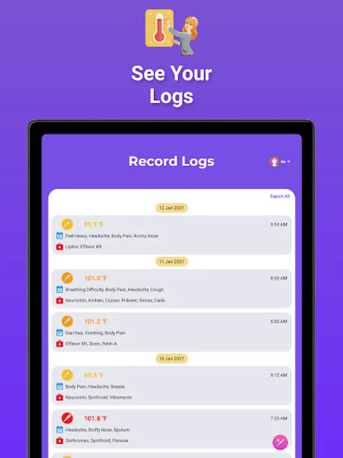Thermometer For Fever is designed for the convenience of the users searching for any body temperature app. Launch this application and enter the values and save the values this application will automatically update the records. The application will view the records entered by the user, view the records and view the summary of the entered records with symptoms and memo. Thermometer For Fever is used to generate graphs statistical analysis and reports on the basis of entered reports. It can be recorded with symptoms such as runny nose and sore throat, so it will be very easy to tell the doctor about the symptoms.
