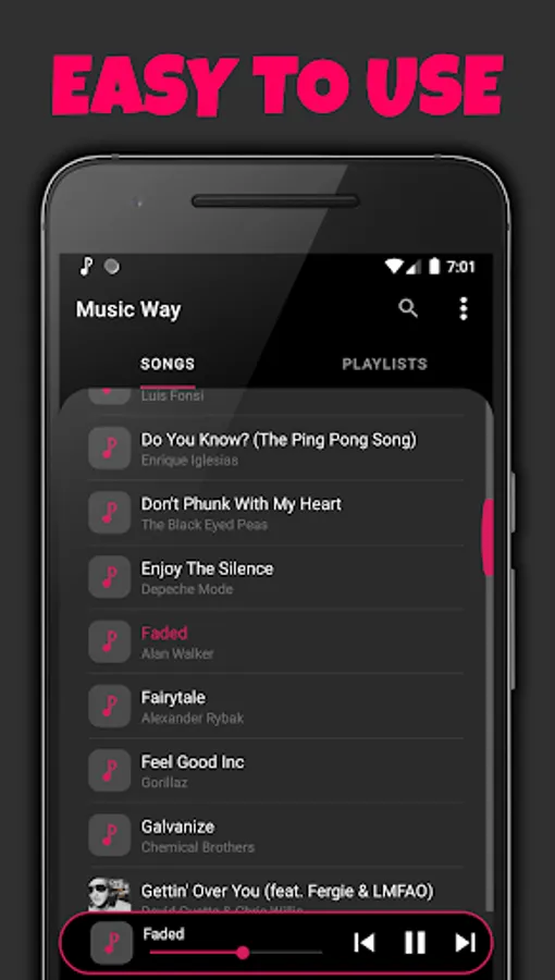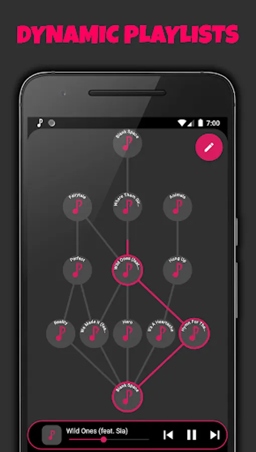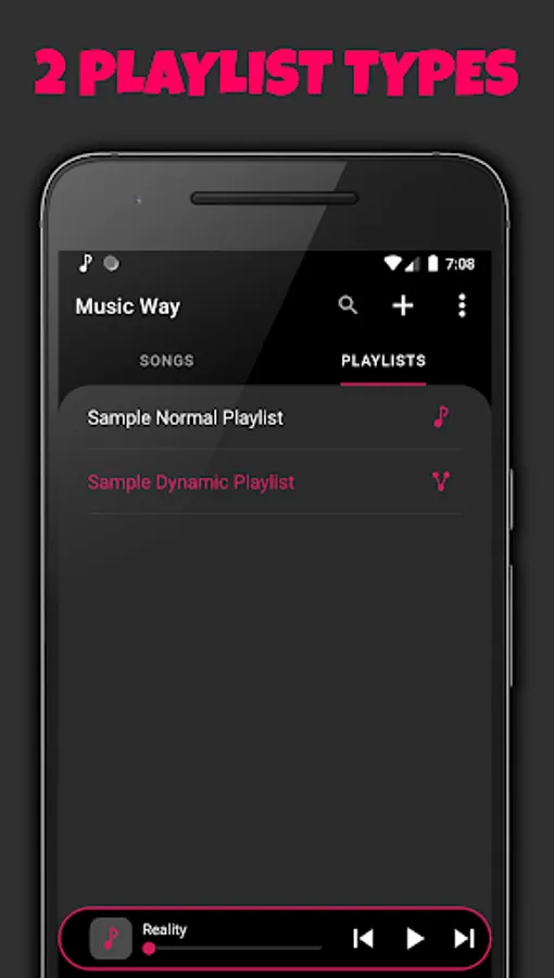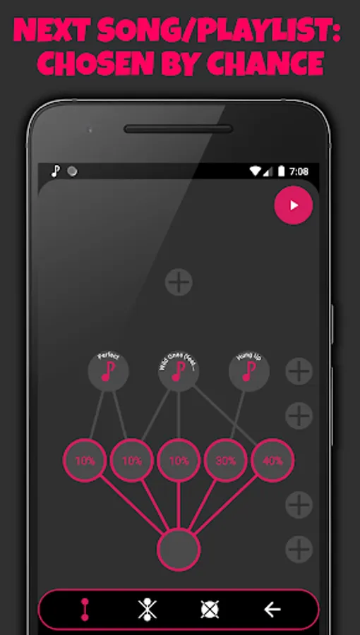 Music Way is a simple Music Player (no ads) with a possibility to create and edit Dynamic Playlists that lets you listen to different song paths based on a chance. Plus it has all the functionality of regular Music Players.
