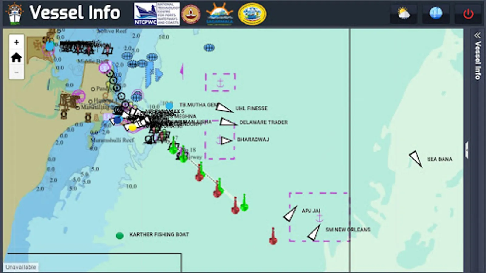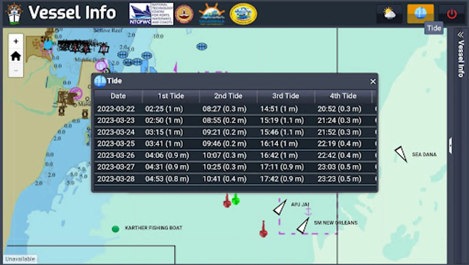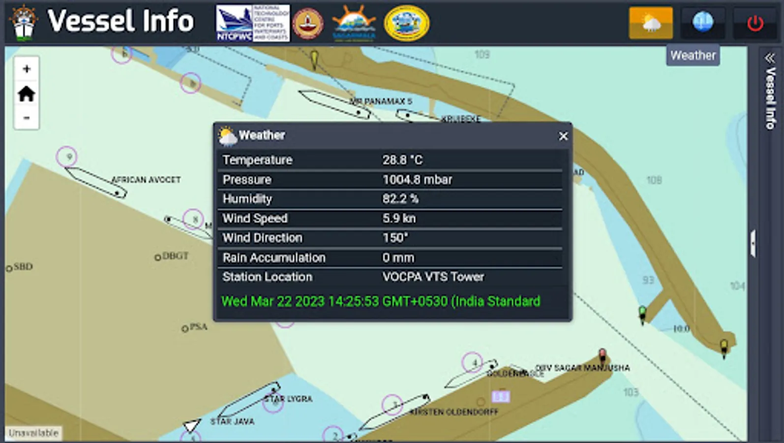 Vessel Info displays the real time position of all the vessels with AIS in Tuticorin Port along with weather and tide data