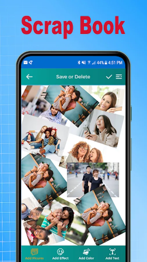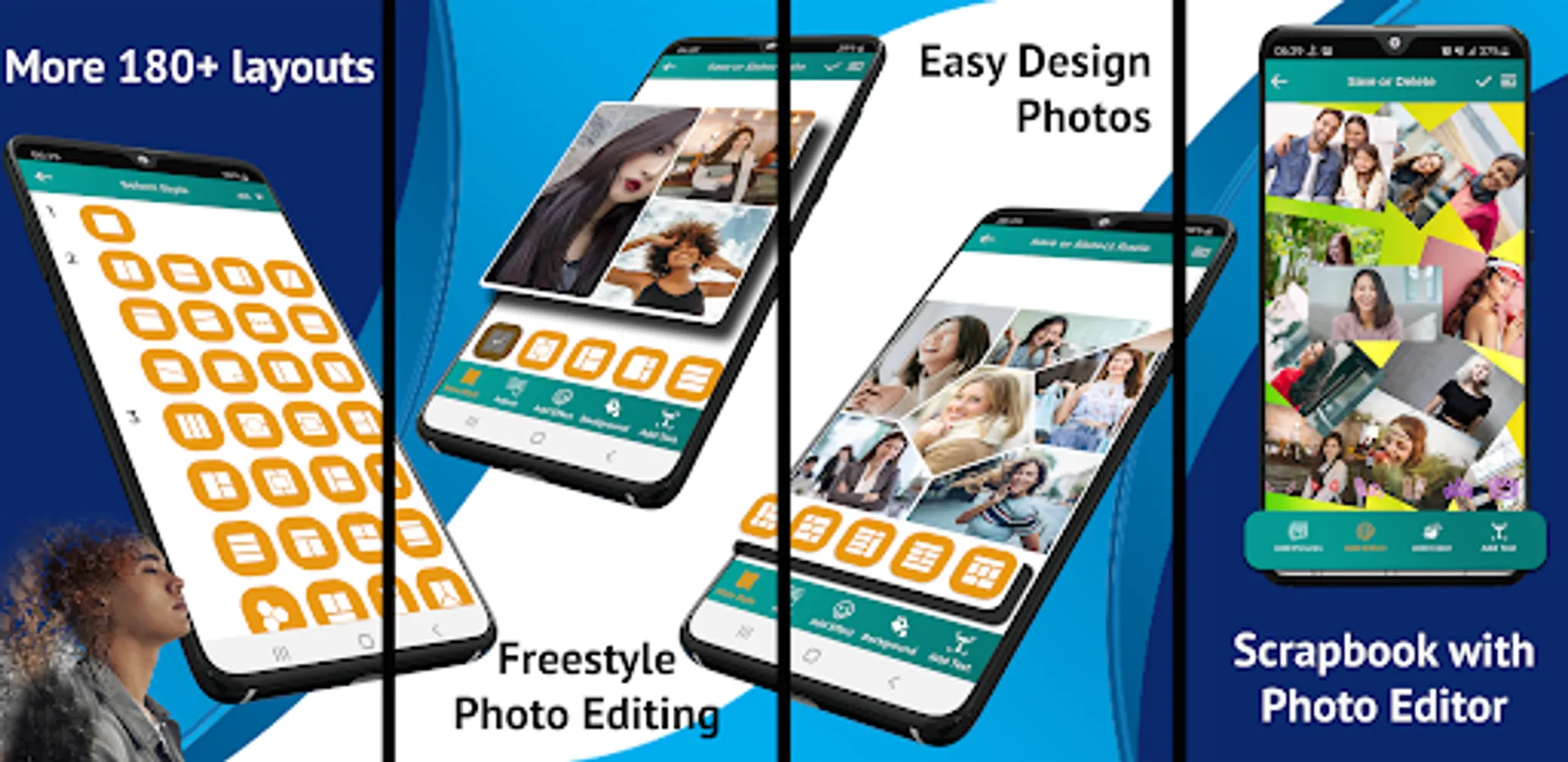 → Scrapbook with Photo Editor powerful tool that helps you to collage your photos with various scrapbook layouts and make a great collage diary.