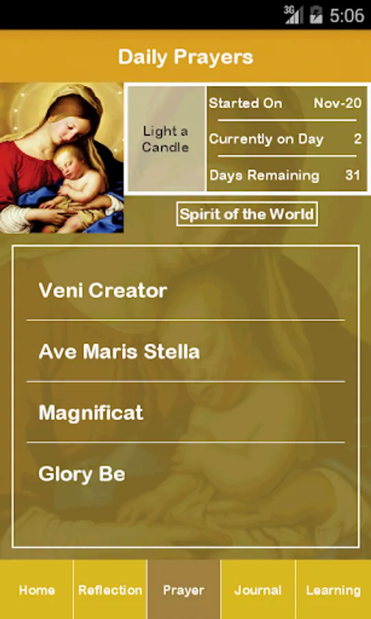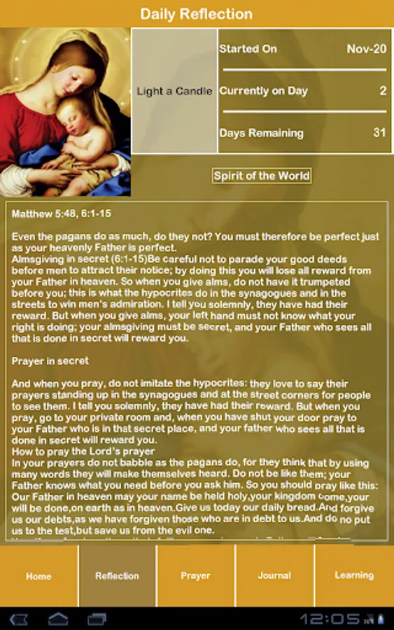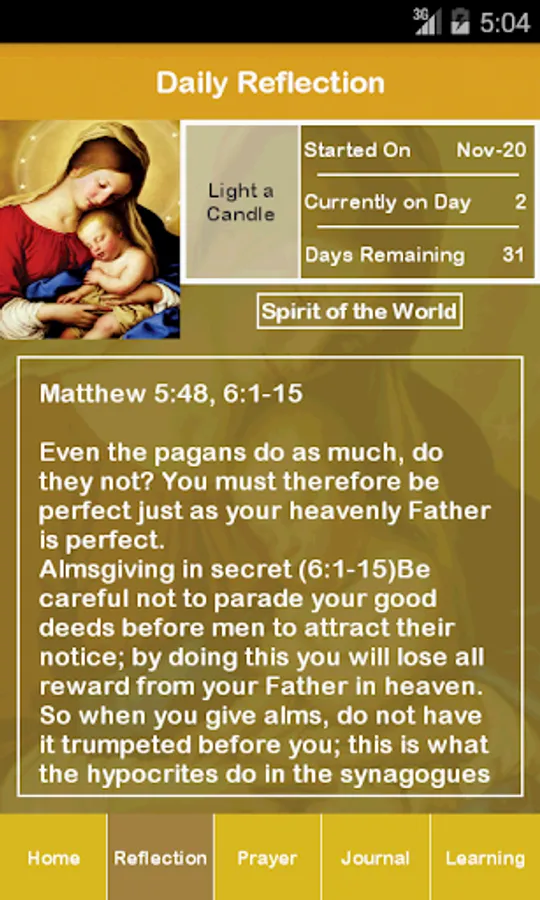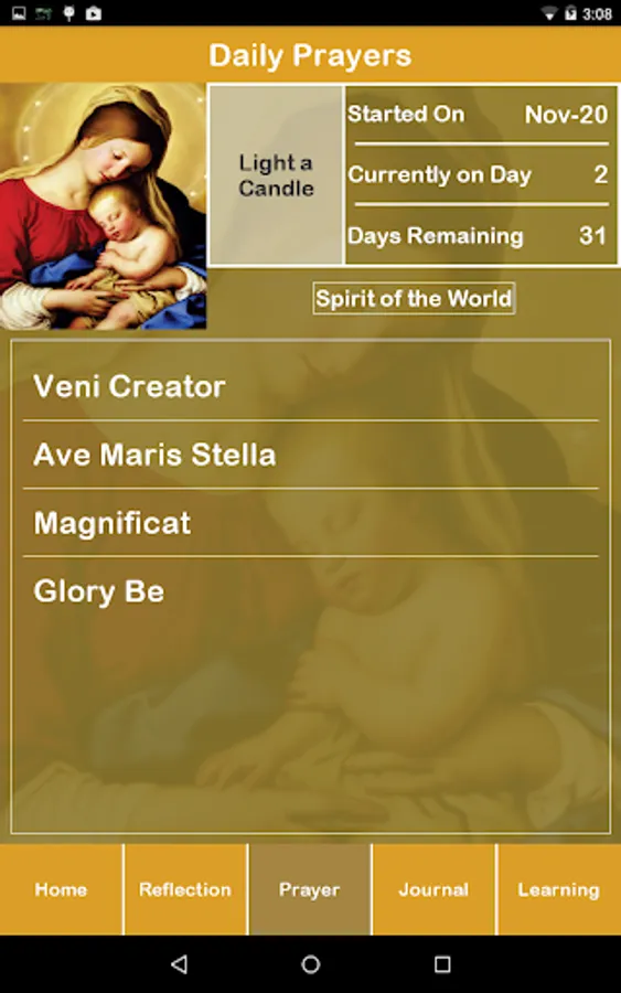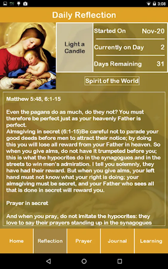 During the 33 day retreat, users are invited to light a candle offering for a personal intention or for a special cause. The lit candle will burn for 9 days, during which time the user can share the lit candle and prayer with the person they are praying for, to encourage them and let them know that they are being prayed for. The candle once lit will also appear on the world candles view, where the user can receive prayers from other users or can tap a candle and pray for someone else - as a sign of our Christian unity, as the body of Christ.