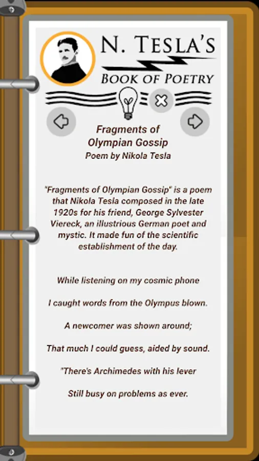 ''Fragments of Olympian Gossip'' is a poem that Nikola Tesla composed in the late 1920s for his friend, George Sylvester Viereck, an illustrious German poet and mystic. It made fun of the scientific establishment of the day.