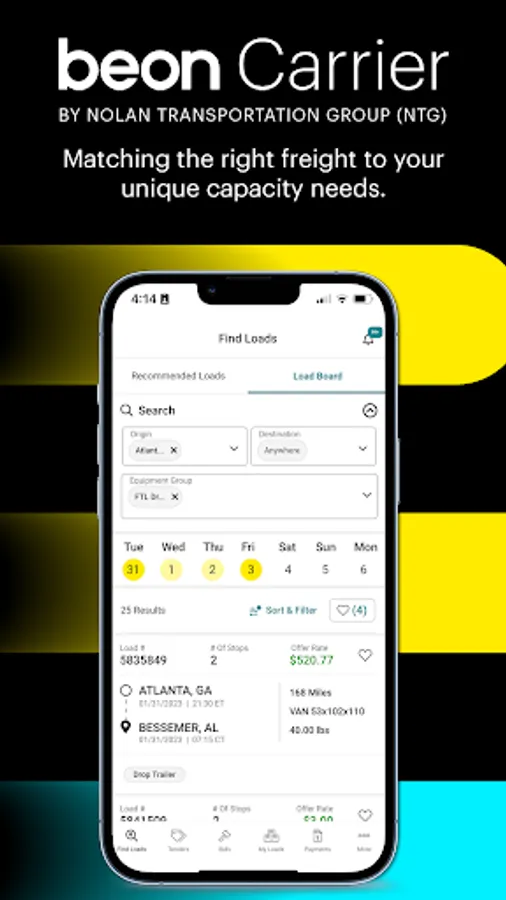 Beon Carrier’s load board allows you to sort and filter available freight to easily find loads that match your needs. You can view all relevant load details so you know exactly what each shipment requires. Submit a bid on a load and if the price is right -- book it right on the spot with a single click.