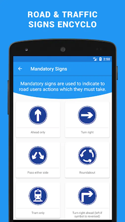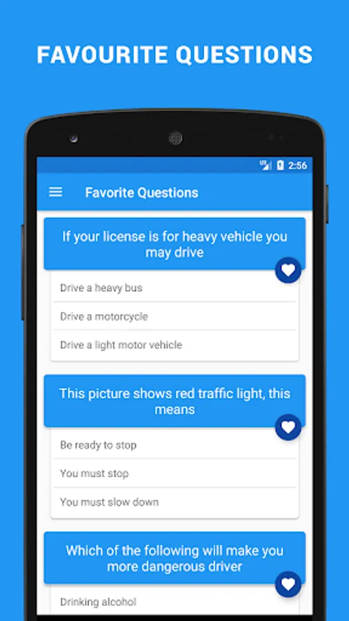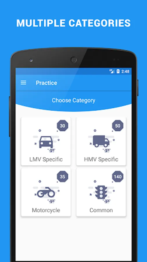 This app contains 250 questions and common questions in all categories, it also contains 190 road signs of all categories. You can do practice as many times as you want, in case of the wrong answer you will get highlighted red and green options, where red is wrong and green is the correct answer.