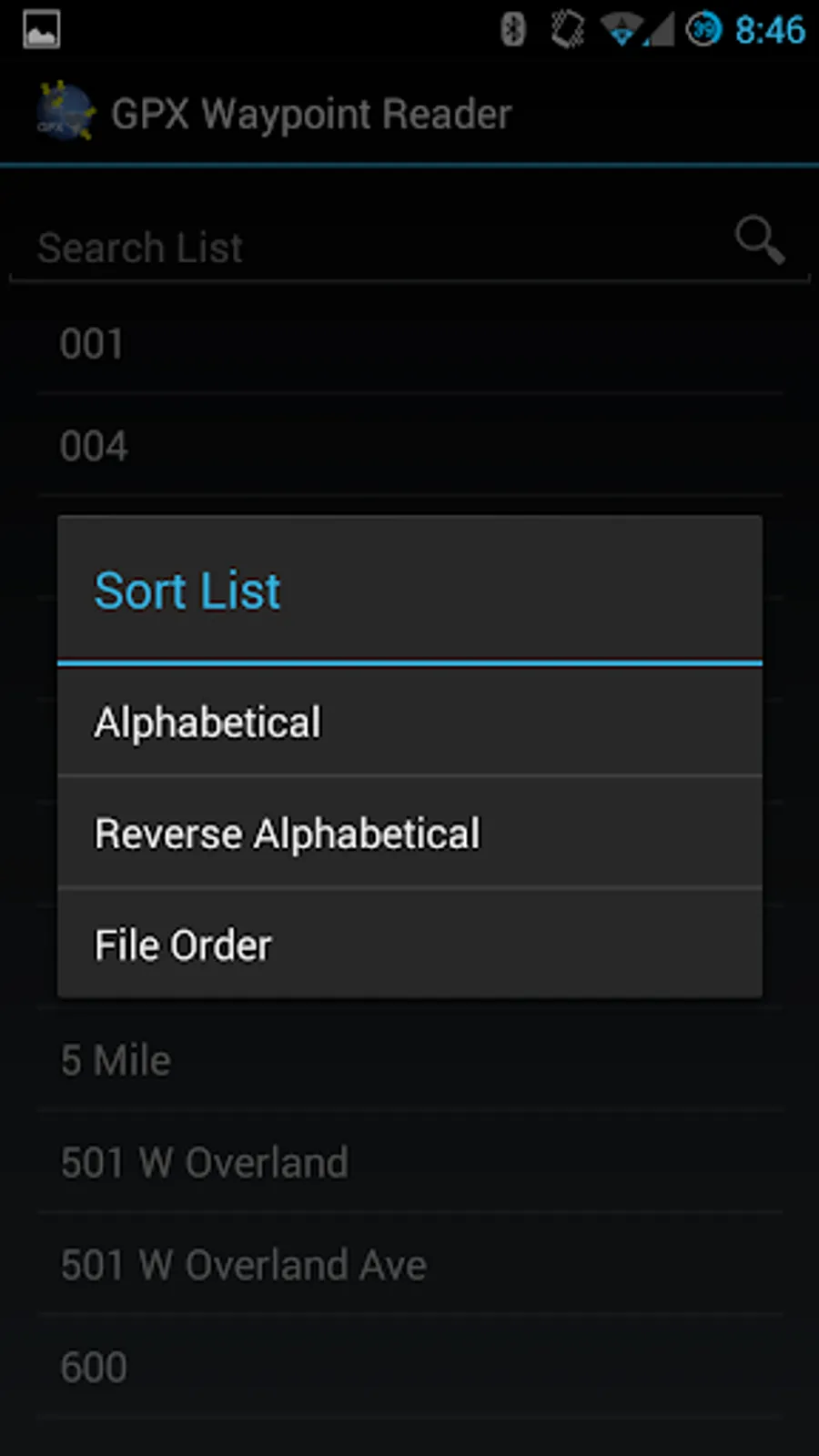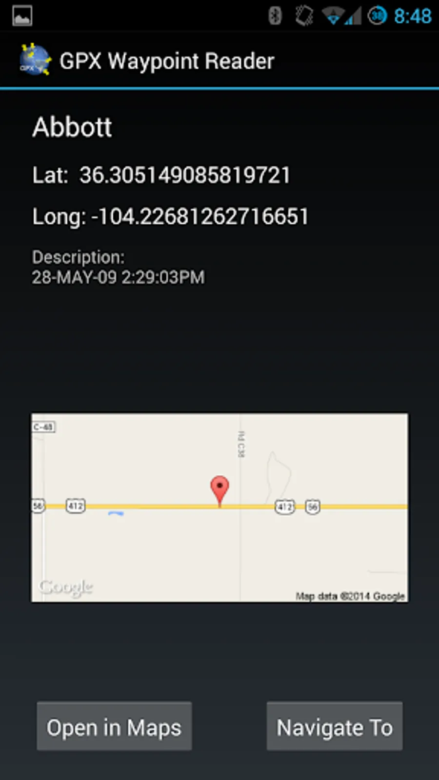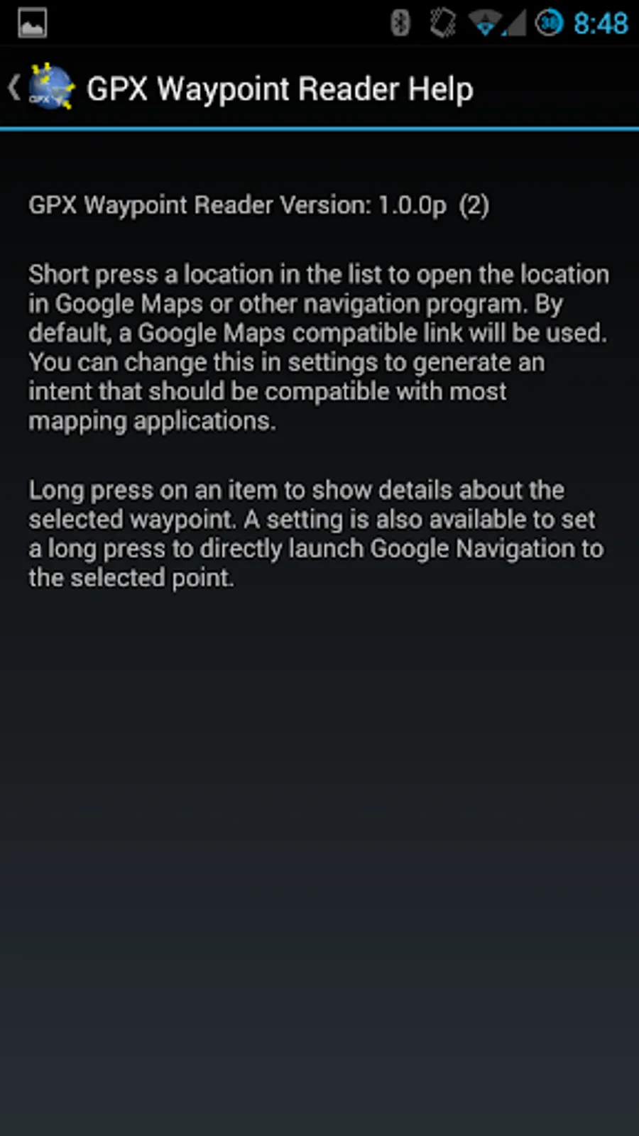 Please note that the app only loads waypoints and ignores tracks in the file. It is recommended that you have Google Maps installed.