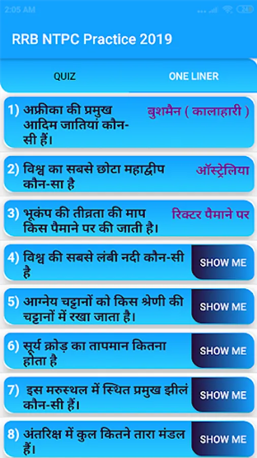 ❂ Quiz And Oneliner Two-Mode for RRB NTPC paper Test and non technical Exam Preparation.