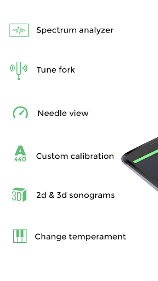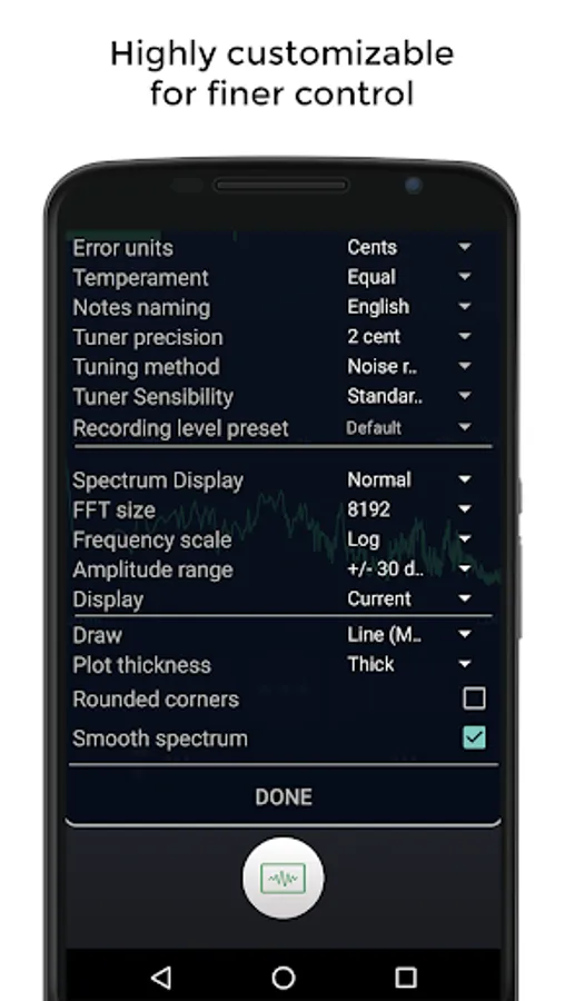 Tap to adjust the spectrum analyzer visualization options, select thicker spectrum lines, smooth out or highlights peaks, increase or decrease tuning sensitivity and precision (up to 0.1 cents)