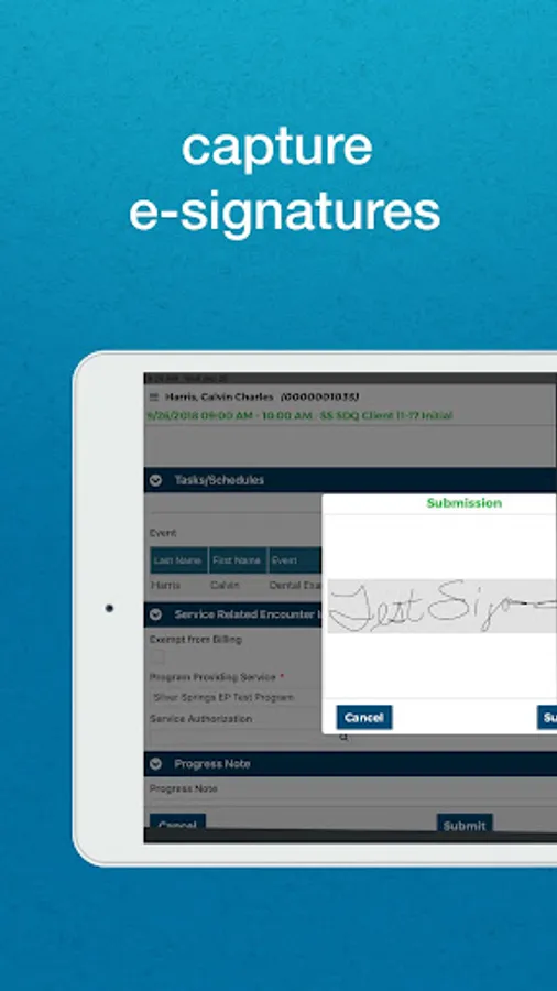 Using a tablet, session data, data collection and electronic signatures are captured, stored and automatically synchronized to the person’s electronic health record (EHR) thereby creating a complete view of the person’s care history.