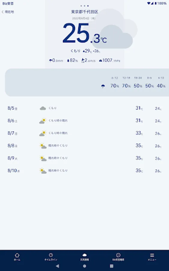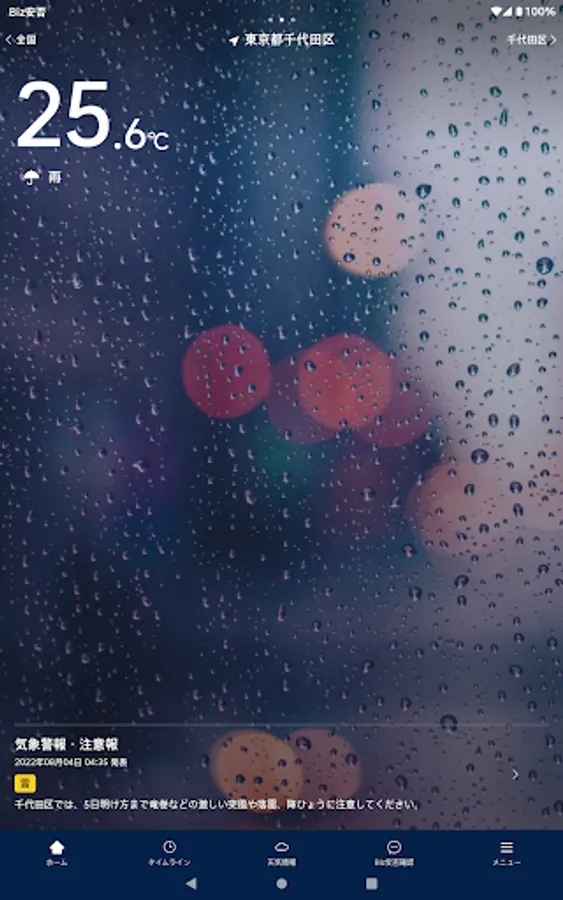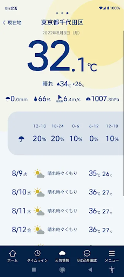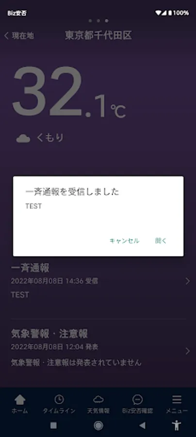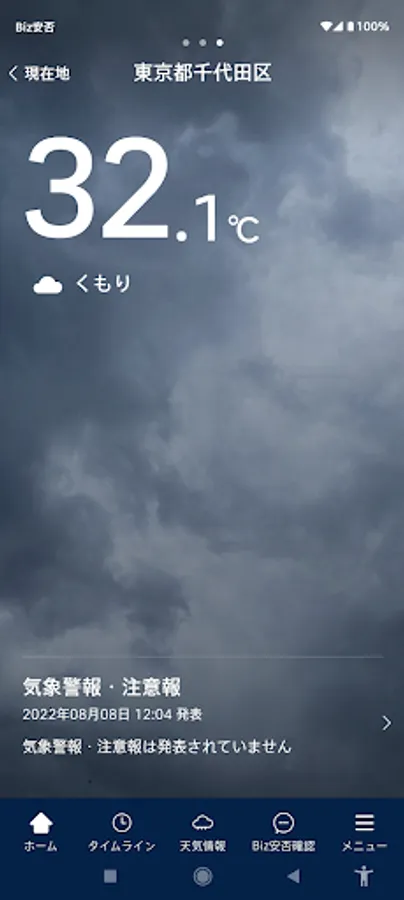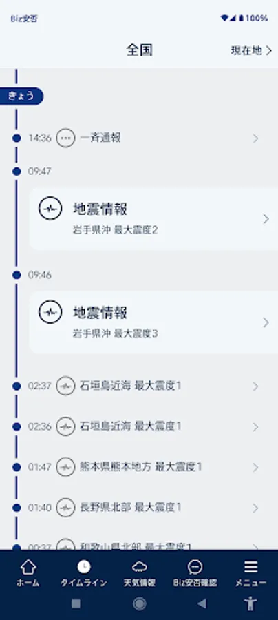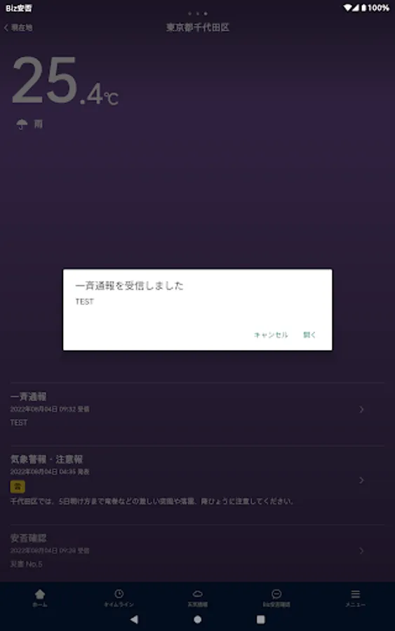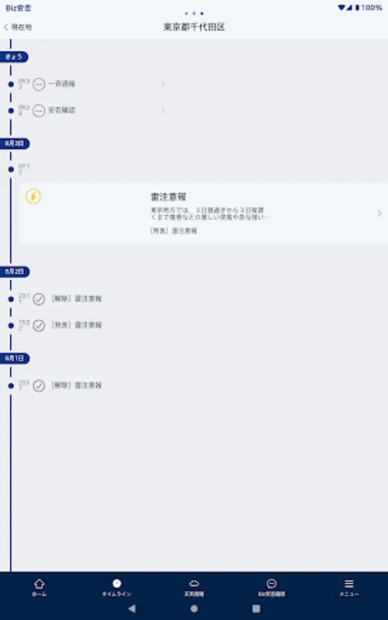 ・On the timeline, you can check disaster prevention/weather information nationwide, your current location, and registered areas, as well as notifications from Biz Safety Confirmation.