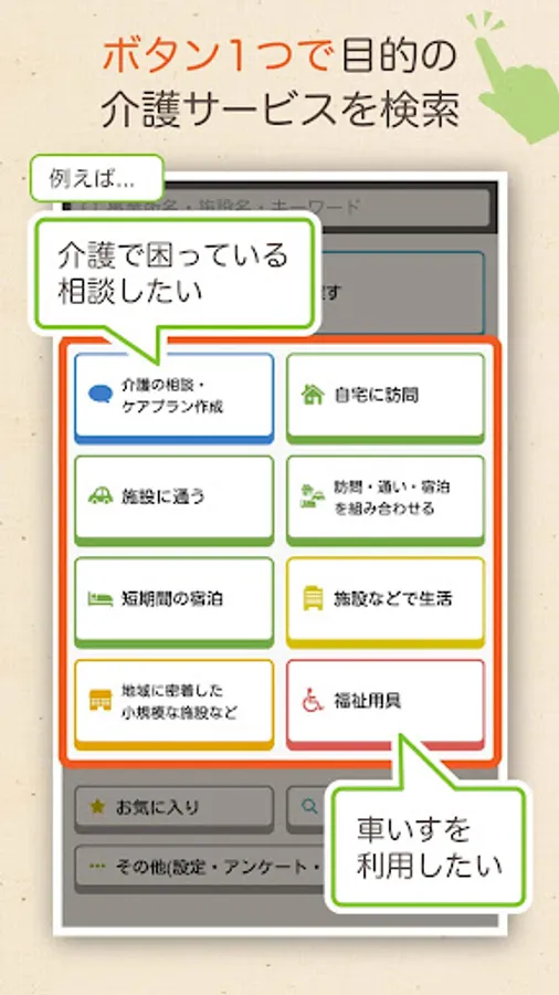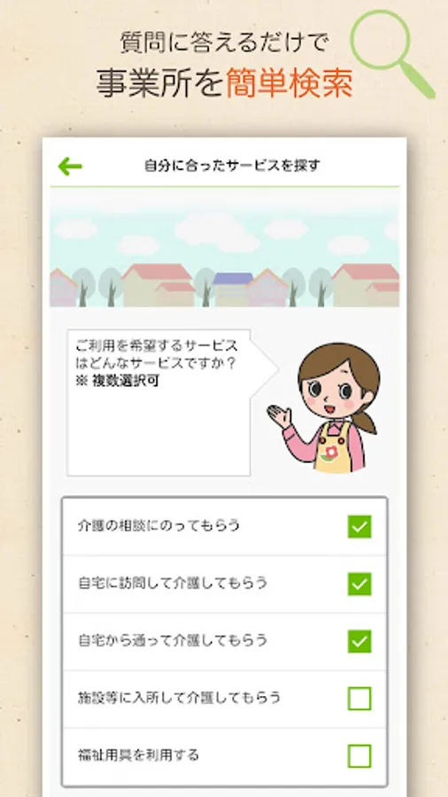 "Nursing care business navigator" is the official app of the Ministry of Health, Labor and Welfare that can easily search for nursing care services nationwide.