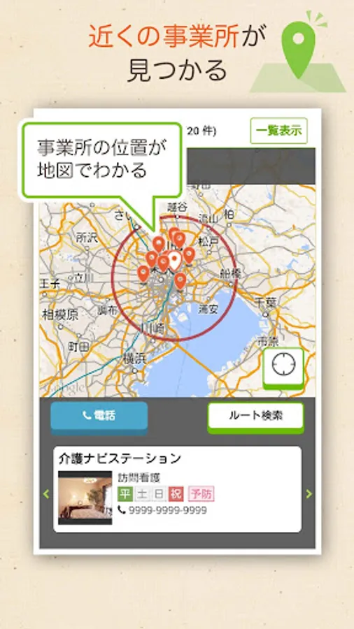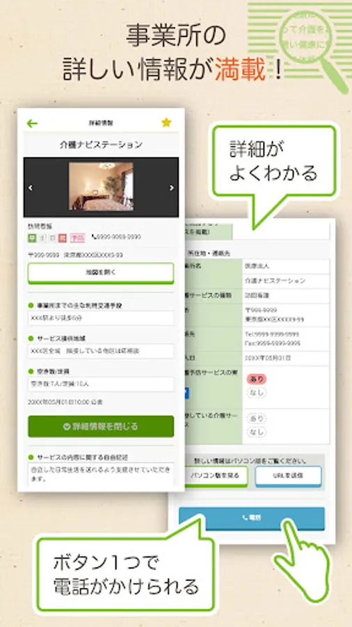 You can easily use various functions such as browsing useful information when selecting a care service establishment, checking the location of the establishment on a map, and making inquiries by phone.