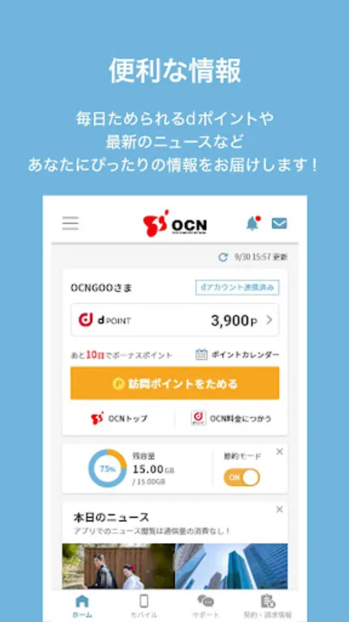 By linking your d ACCOUNT and OCN account, you can view d POINTs in the app, use d POINTS to pay for OCN services, and earn d POINTs every day with the visit point function.