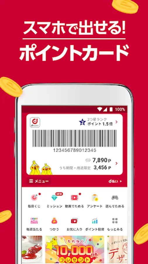 See your available points in real-time through the d Point Club app. Get special discount coupons, and free-entry to our special campaigns to gain bonus points and exclusive treats. You can also use this app as your d point card to exchange points as cash at partner stores.