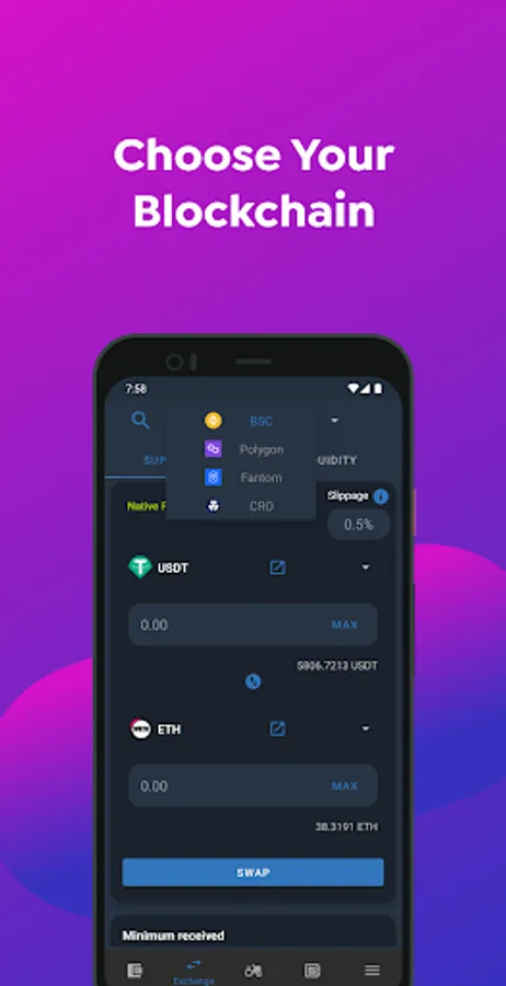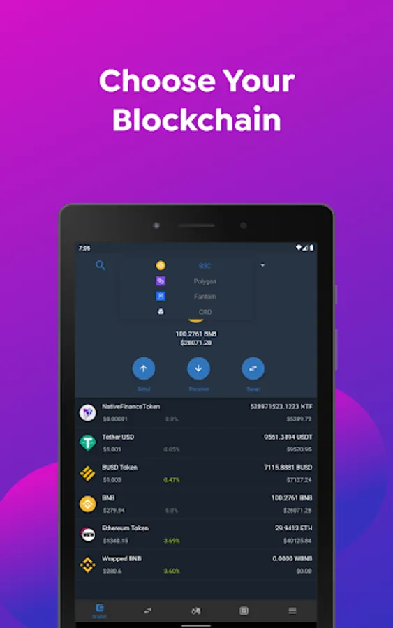 Trade and store multiple cryptocurrencies such as BNB, Ethereum, Matic, FTM, and many other ERC20, BEP20 and ERC721 tokens on your device.