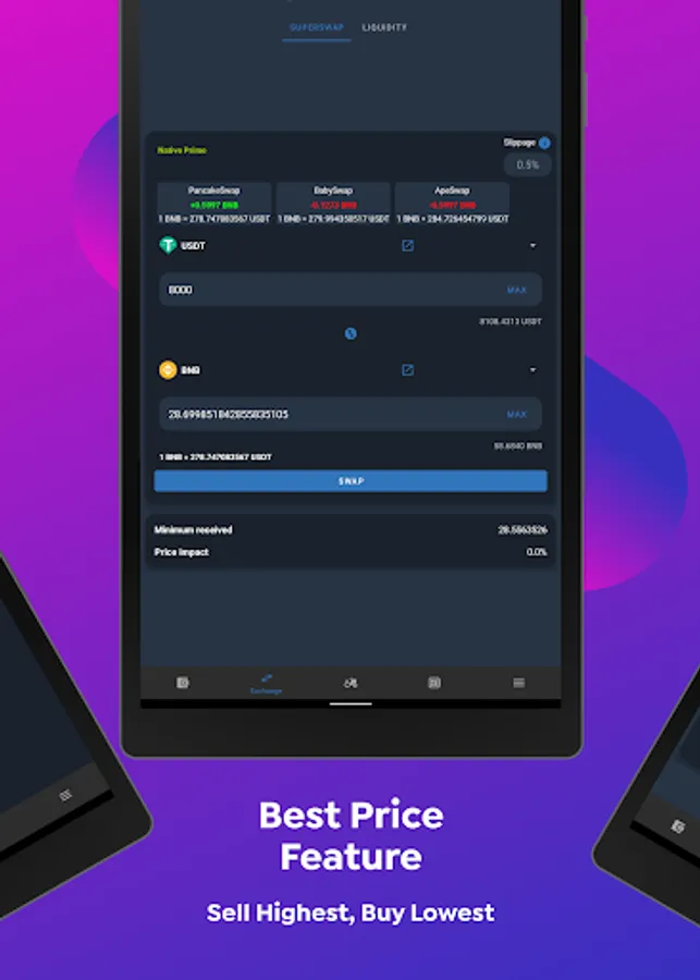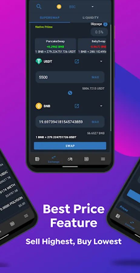 Best Price feature - Super-Swap will check for you in all the swaps from a predefined customizable list on the currently used blockchain and fetch the Highest price for Sell and Lowest price for Buy!