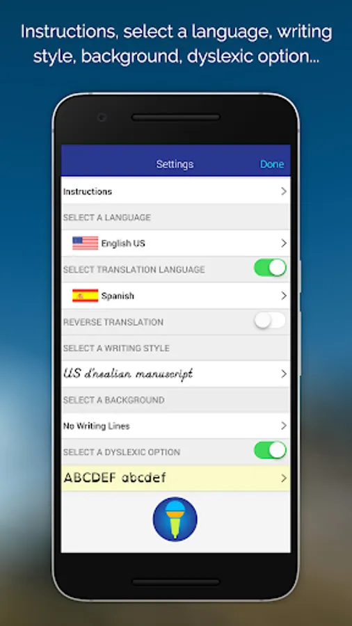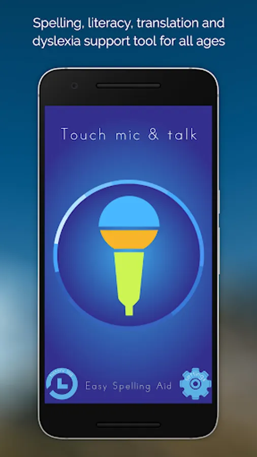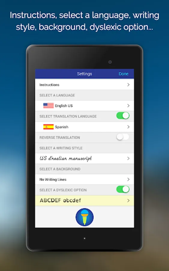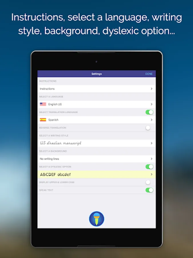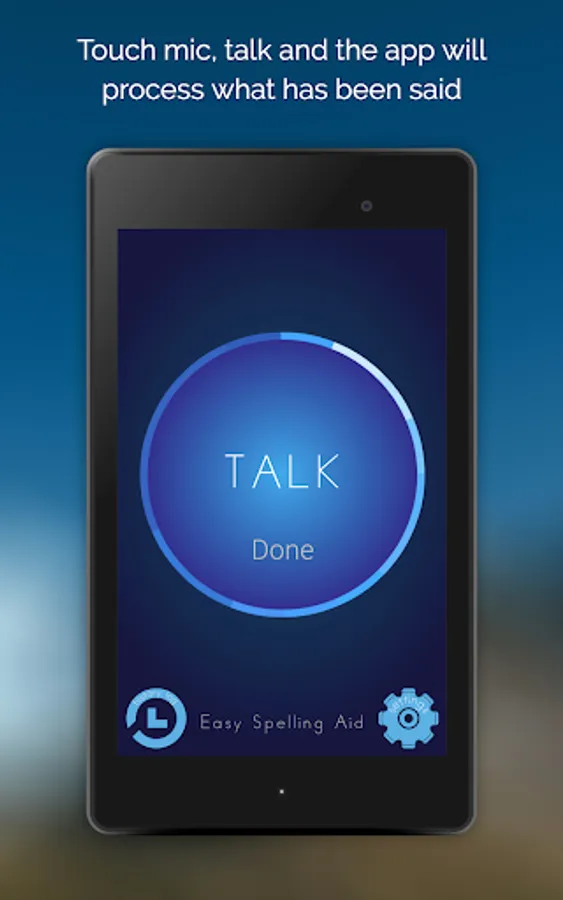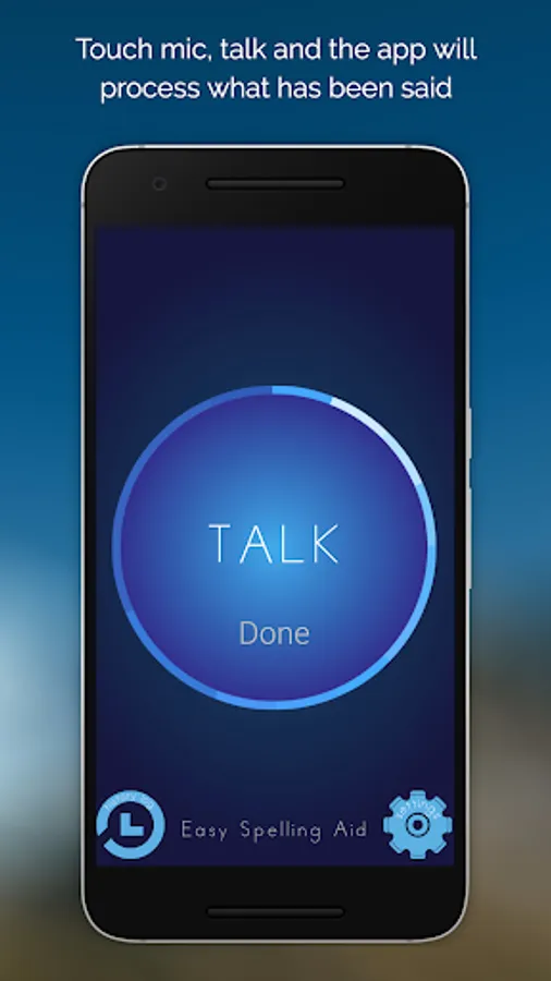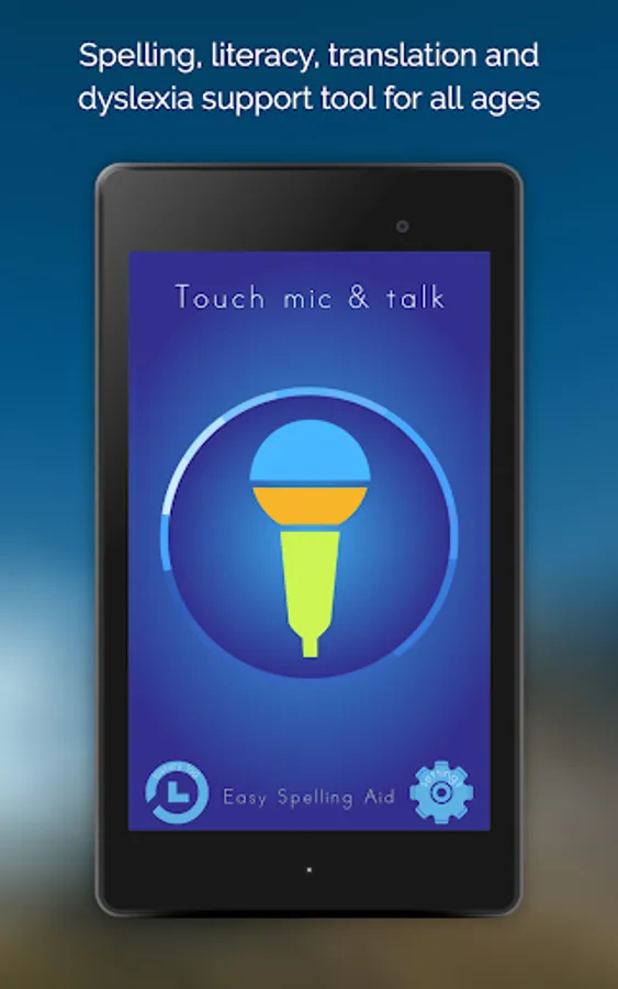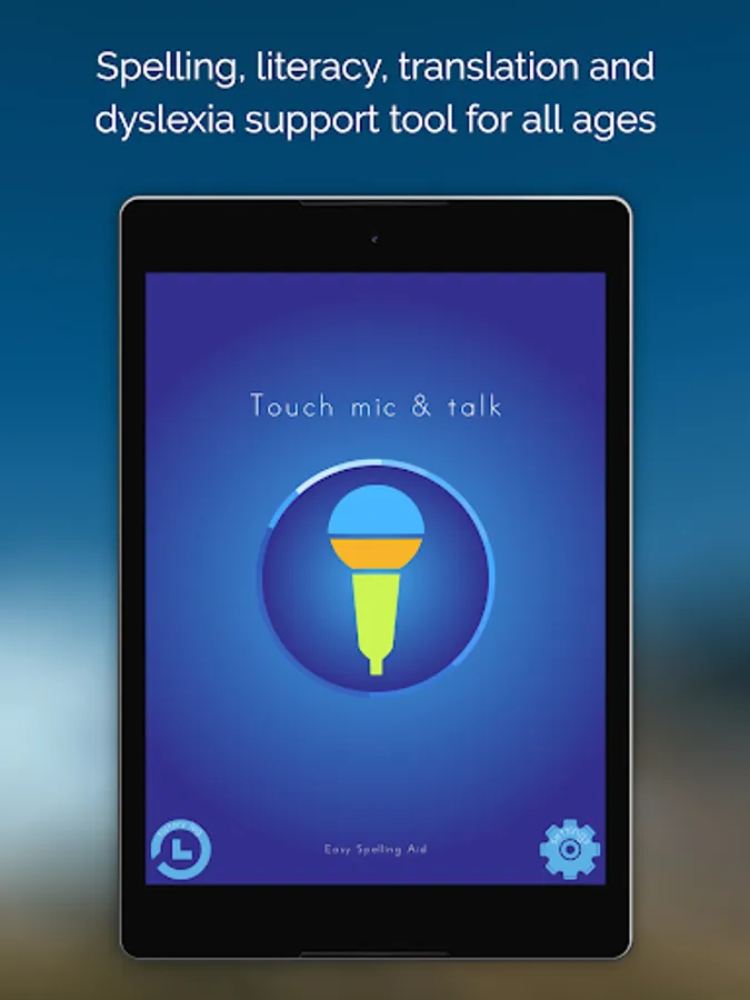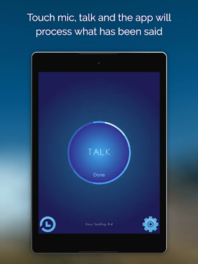 Upon opening the application you are presented with a clear blue user-friendly interface. The instruction 'Touch mic & talk’ is displayed above a circular mic symbol. On touching the symbol, you are asked to 'Talk.' By pressing done the app will process what has been said and proceed to produce your input displayed in your chosen writing style. This feature can be changed in the Settings, which are also easily navigated to from the main screen. Additionally, within the Settings, you can change between multiple languages, select translation language, reverse translation, select a background, select a dyslexic option, display upper and lower case letters and turn off speech output if you wish. Easy Spelling Aid also features a History Log, which saves spelling results including translations.