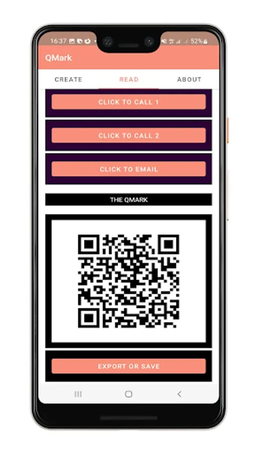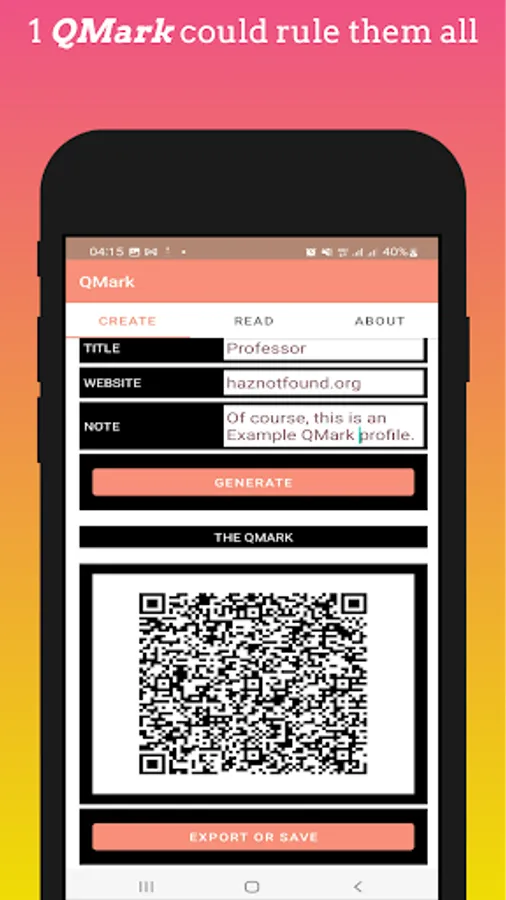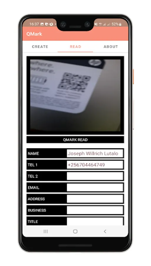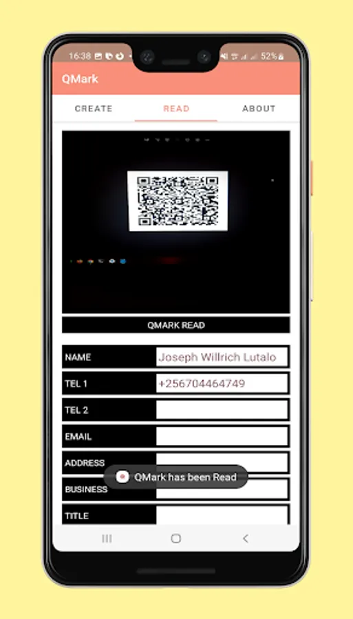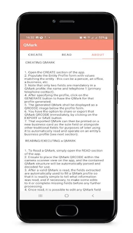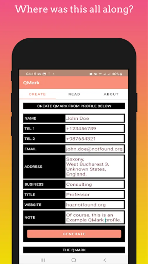 Creating a QMark for a person, such as Prof. John Doe, of Saxony, West Bucharest 3, reachable by office contact +1234567890 or work email john.doe@notfound.org, basically consists of specifying these datums in the fields provided on the QMark app's "CREATE" screen. Then simply generate the QMark QRCODE, and it's ready to use!